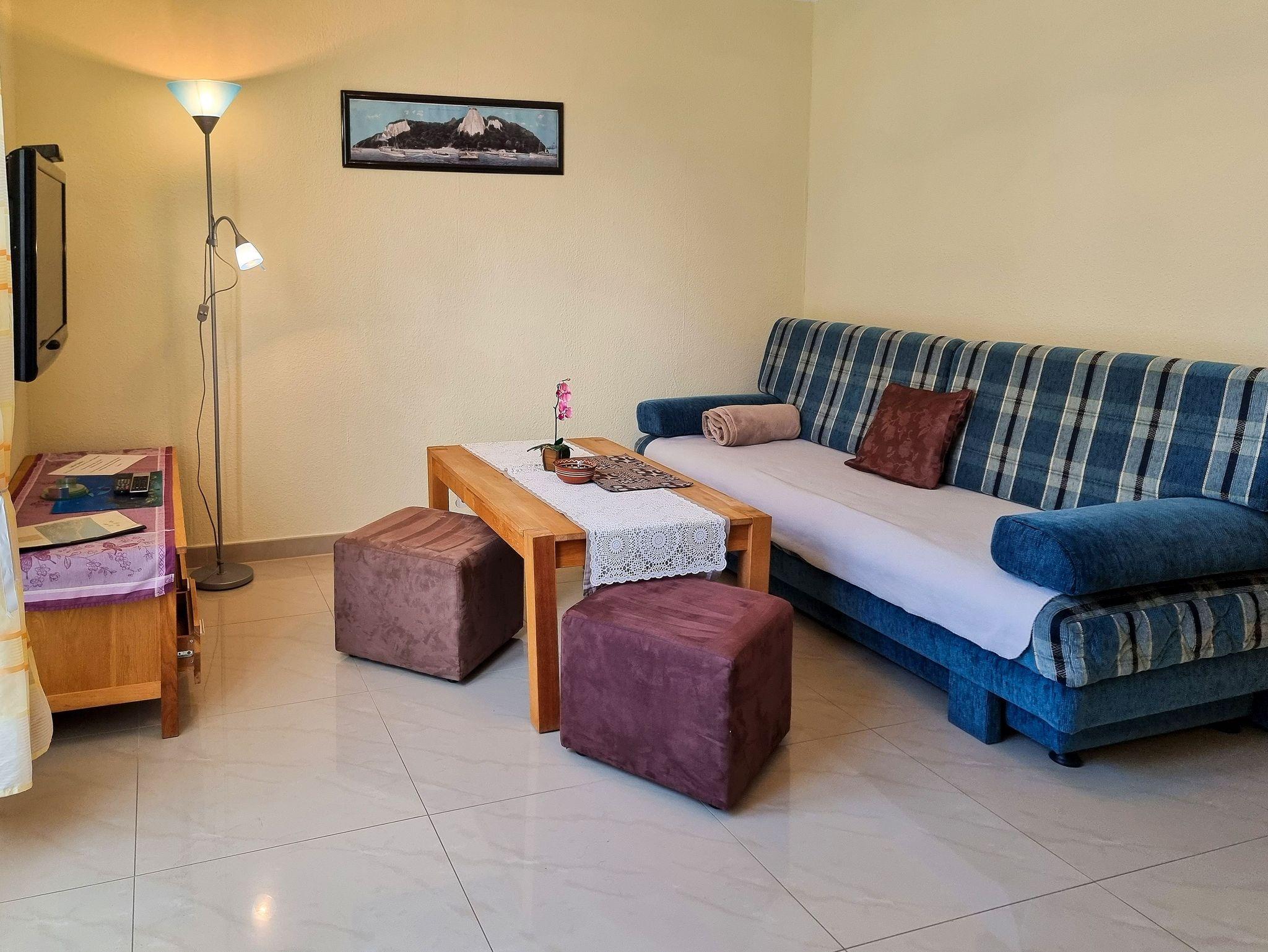 • Der Wohnbereich bietet eine gemütlicher Couchgarnitur, die auch als Aufbettung dient, Flachbidfernseher, kostenfreies WLAN, sowie ein Esstisch mit Stühlen für 3 Personen.