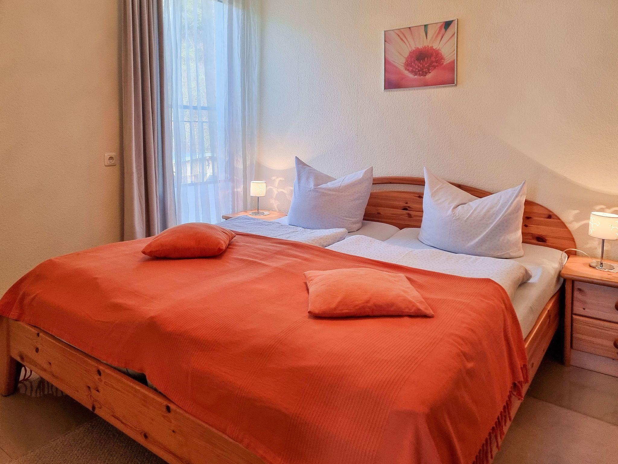 • Das Schlafzimmer ist mit einem Doppelbett, Nachtschränkchen, Leselampe und Kleiderschrank ausgestattet.