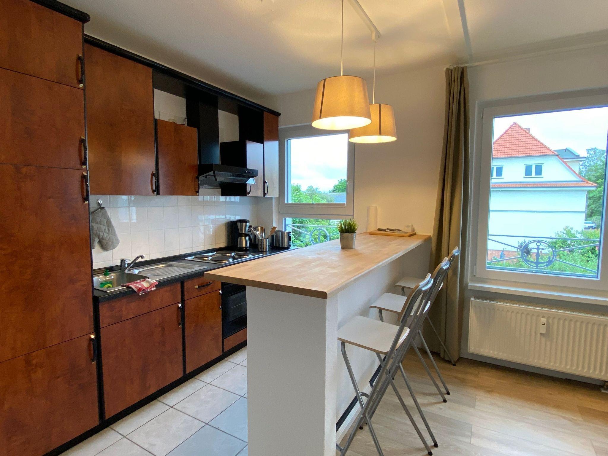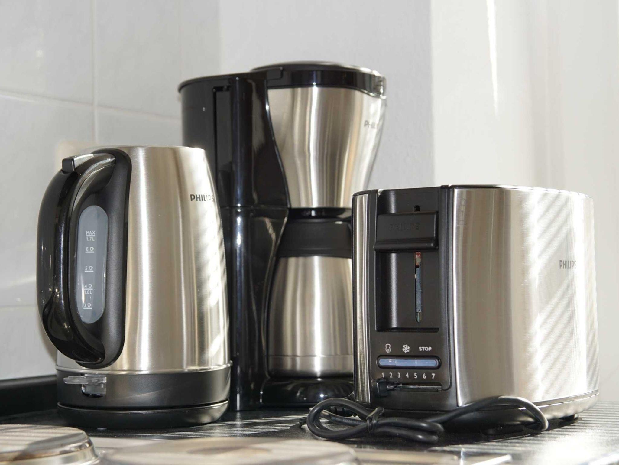 Die Küche ist ausgestattet mit Cerankochfeld, Backofen, Mikrowelle, Filterkaffeemaschine, Toaster, Wasserkocher, Kühlschrank mit Tiefkühlfach, Geschirr, Besteck, Koch- und Bratgeschirr, gemütlicher Sitztresen und vier Hochstühle.
