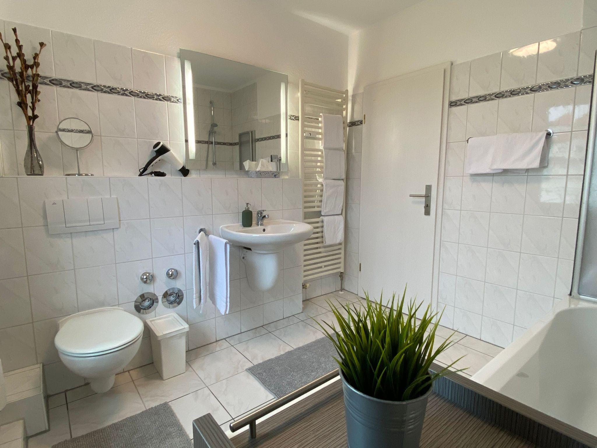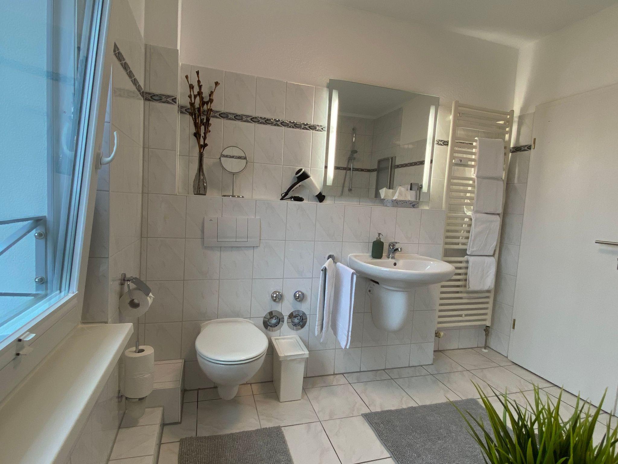 Bad mit Dusche, WC, Waschbecken, großer beleuchteter Spiegel, Schminkspiegel.