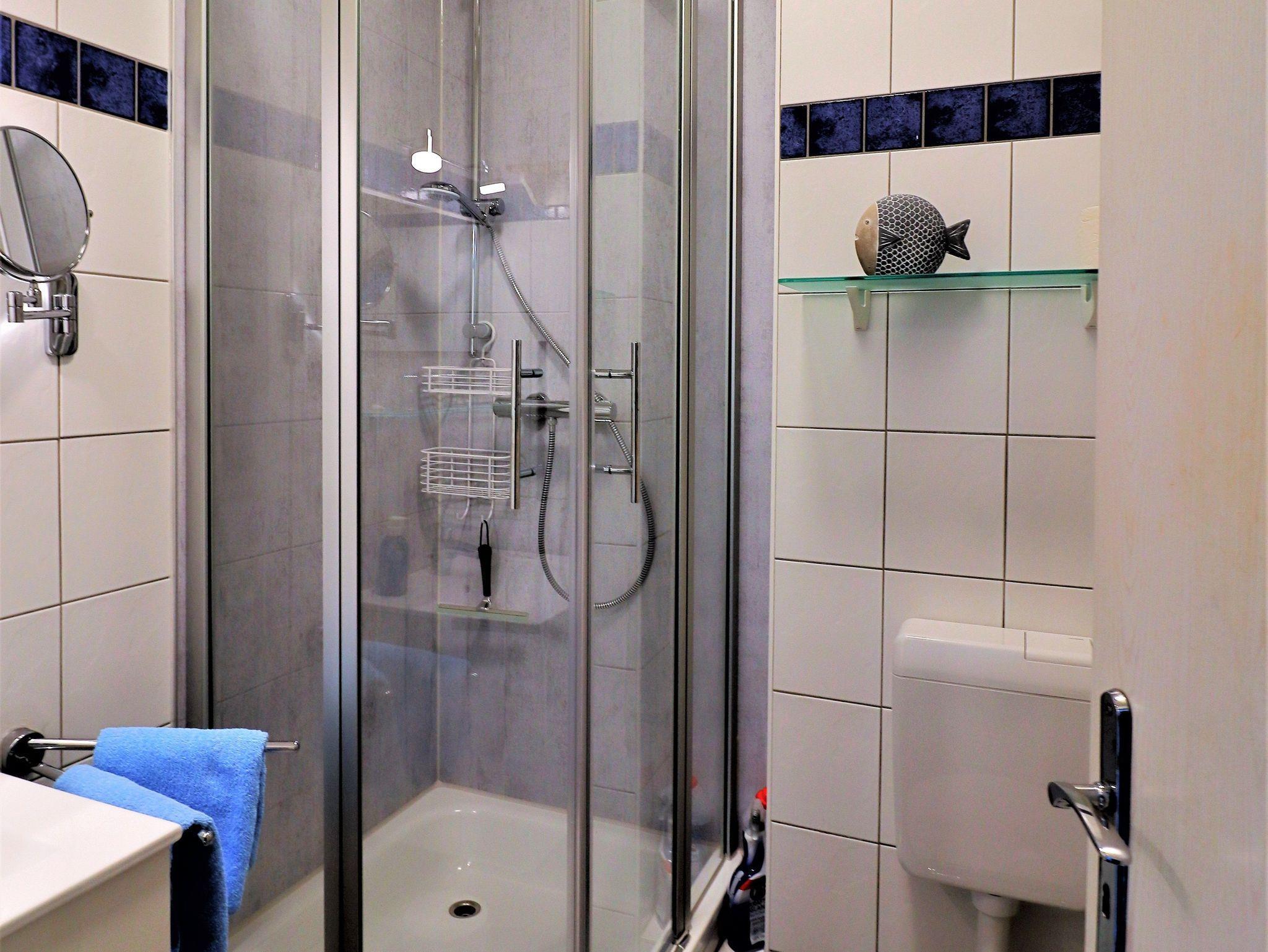 Das helle Badezimmer (ebenfalls renoviert) mit Dusche und WC begrüßt sie am Morgen mit angewärmten Handtüchern.