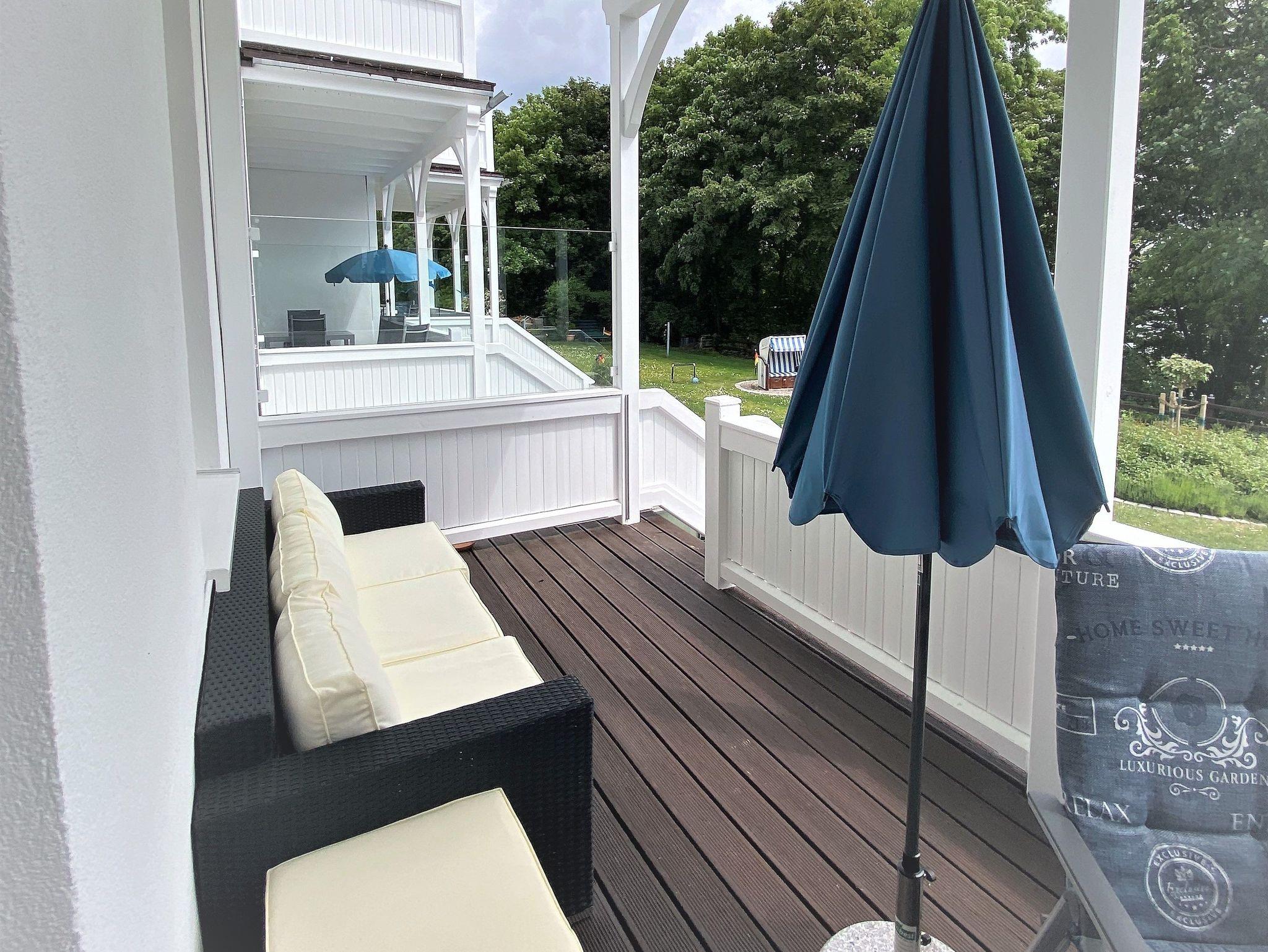 Die windgeschützten Balkone befinden sich alle auf der dem Meer zugewandten Süd-Seite, in dieser Wohnung mit direktem Zugang zum großen Garten.