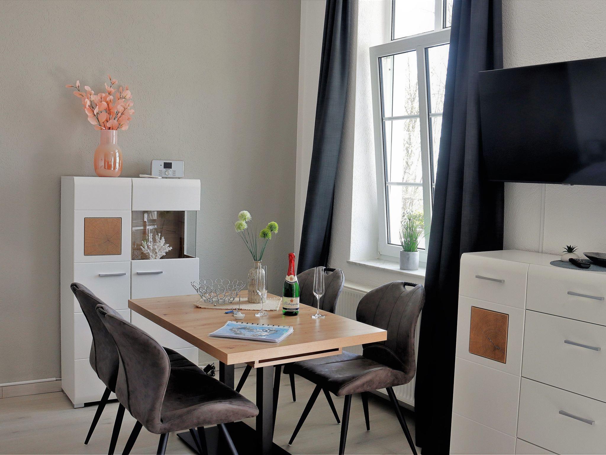 Das 2022 komplett renovierte und neu eingerichtete Apartment verfügt über einen gemütlichen und großzügigen Wohn- Essbereich - mit Sicht auf den liebevoll gestalteten Garten und das Meer.