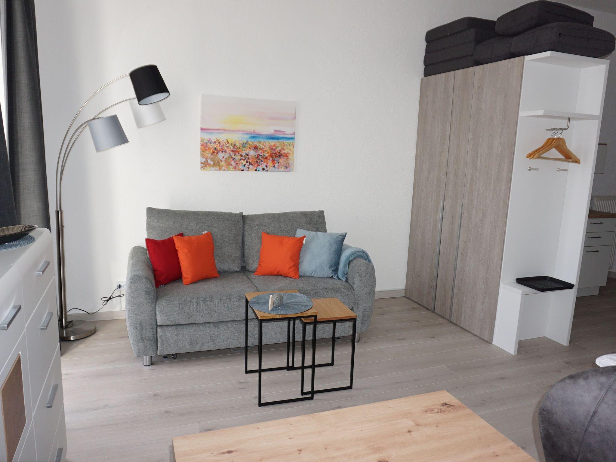 Der geschmackvoll eingerichtete Wohnbereich lädt auf einer hochwertigen (Schlaf-)Couch zum Entspannen ein.