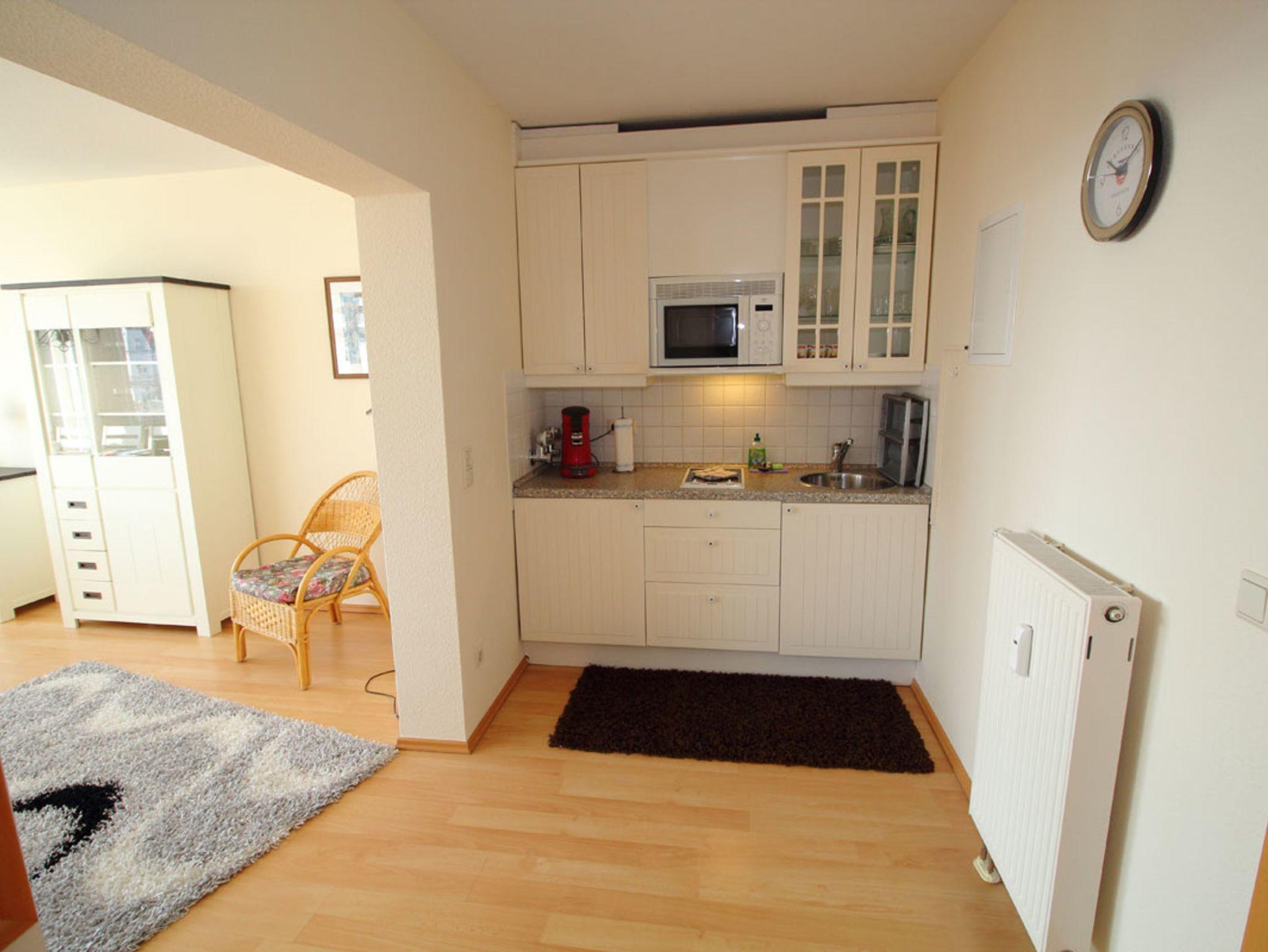 • Die Küche ist ausgestattet mit einer integrierten Küchenzeile mit 2-Plattenherd, Mikrowelle, Kühlschrank, Toaster, Wasserkocher und Kaffeemaschine.