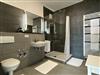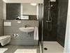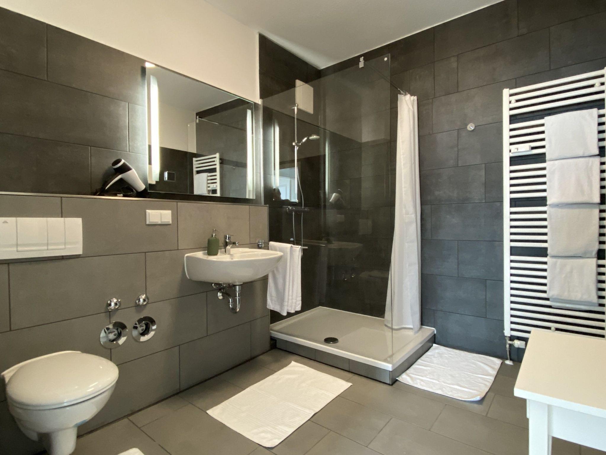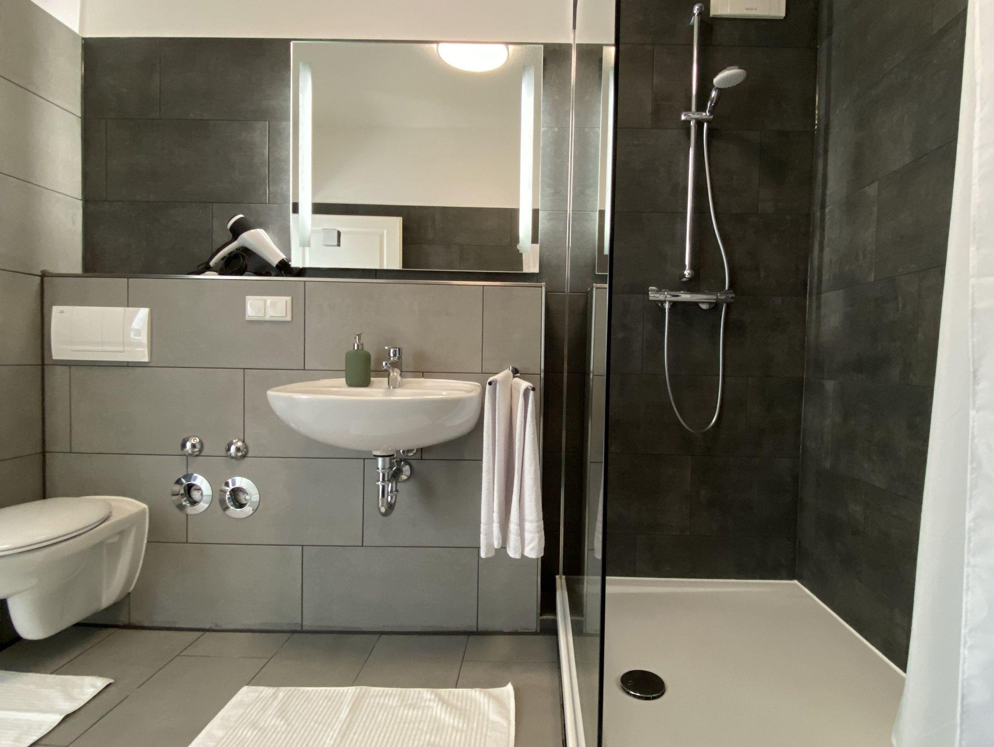 Bad mit Dusche, WC, Waschbecken, großer beleuchteter Spiegel, Schminkspiegel.