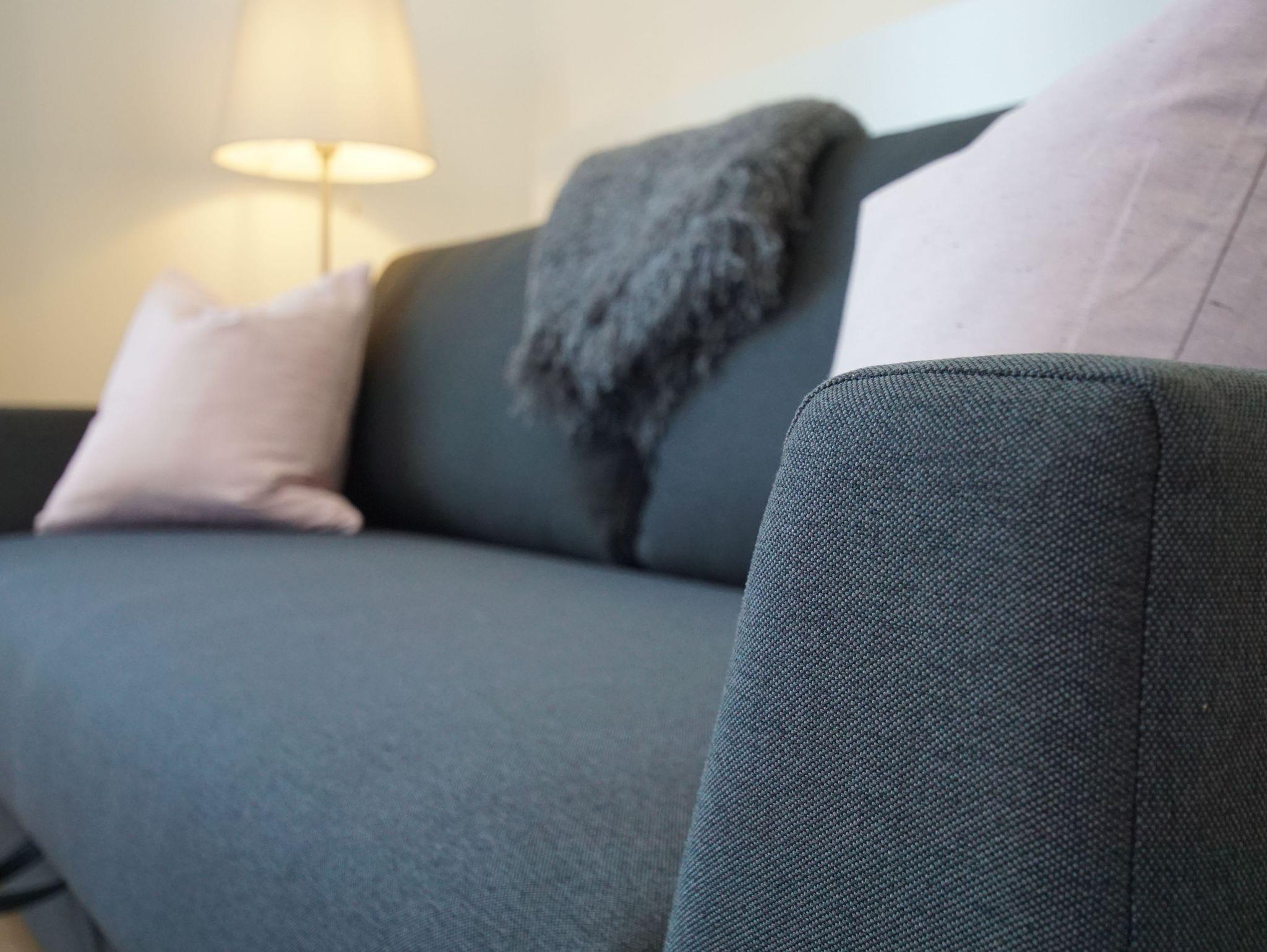 Flur, separate Küche, Wohnzimmer mit super bequemer Bruno-Schafcouch für bis zu 2 Erwachsene, großes separates Schlafzimmer mit TV, Bad mit Dusche.