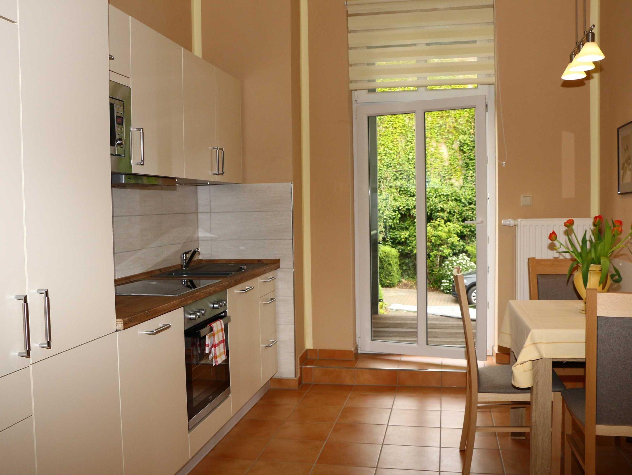 Unsere Ferienwohnung Nr.4 verfügt über ein Sclafzimmer, Balkon, Küche, Bad und ein Wohnbereich. Die Ferienwohnung ist für 2 Personen eingerichtet, eine Aufbettung für jeweils 1 weitere Personen ist möglich. Je Wohnung steht ein Parkplatz auf dem Grundstück der Villa Elfriede zu ihrer Verfügung. Küche: Essecke, Herd, Backofen, Microwelle, Kaffemaschine, Wasserkocher, Geschirr etc.
