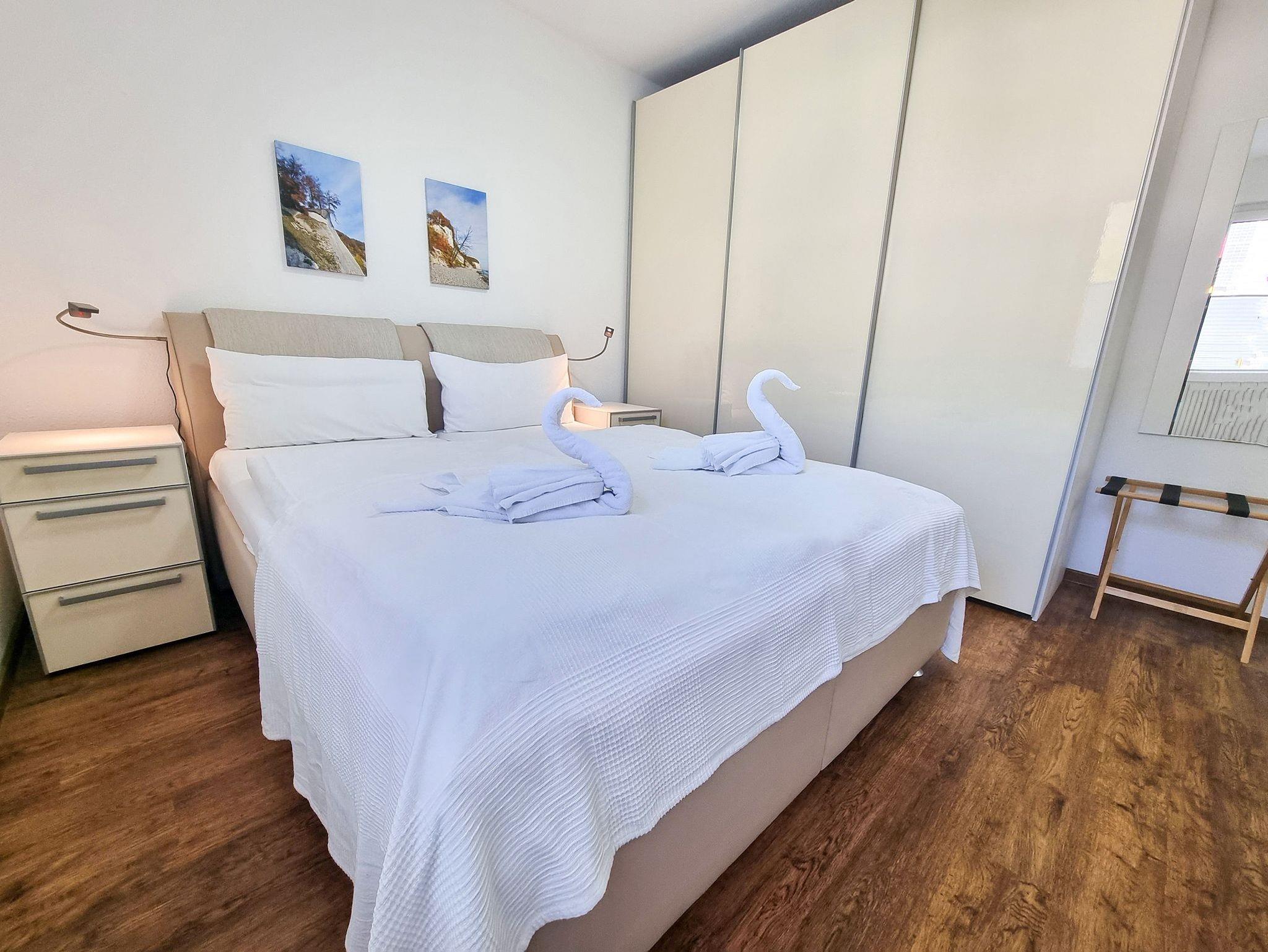 2 Schlafzimmer mit Doppelbett (1,60m breit) bzw Schlafsofa (1,40m breit). Das kleinere Schlafzimmer bietet einen weiteren Flachbild-TV und ein Bluerayplayer.