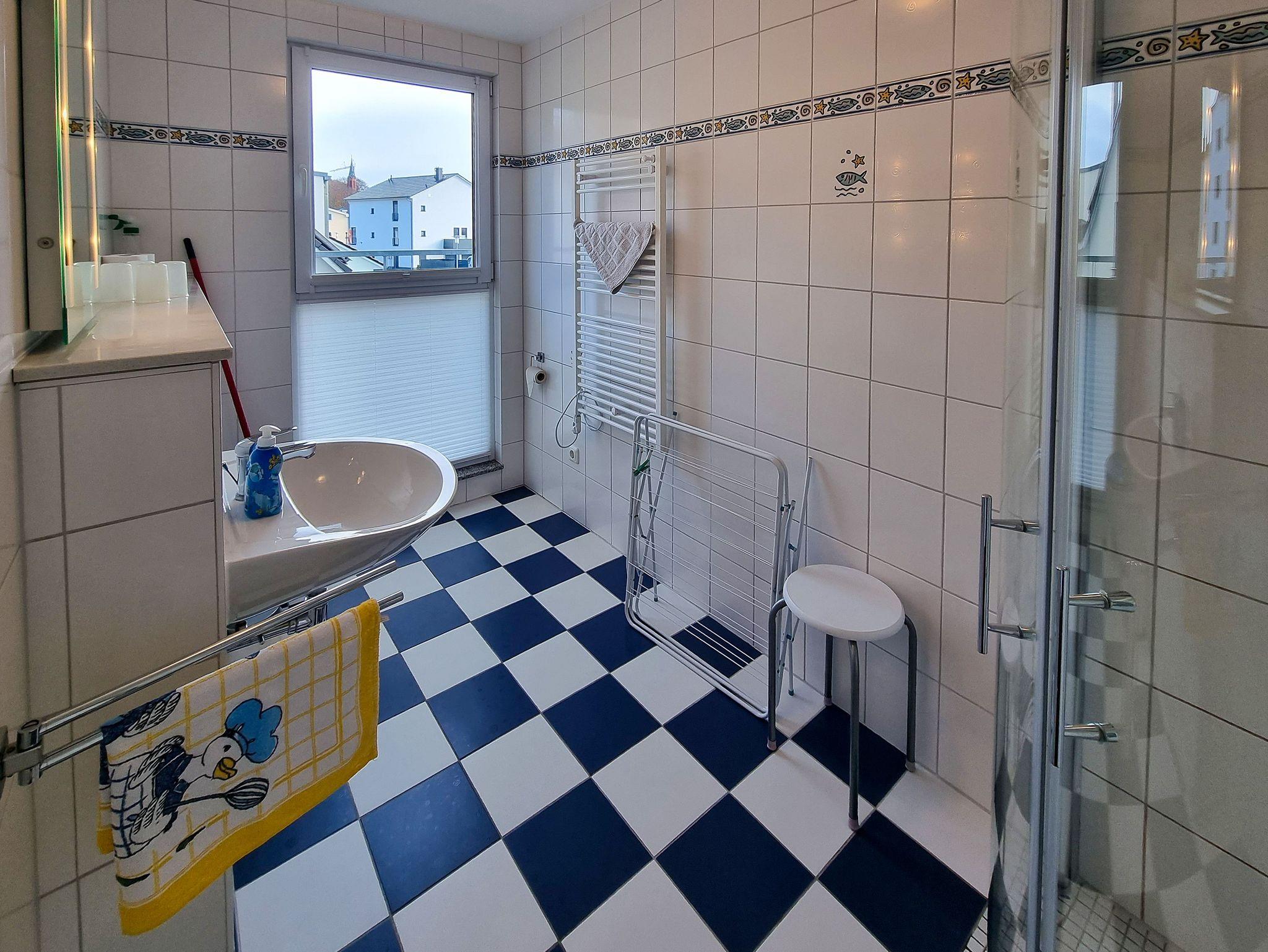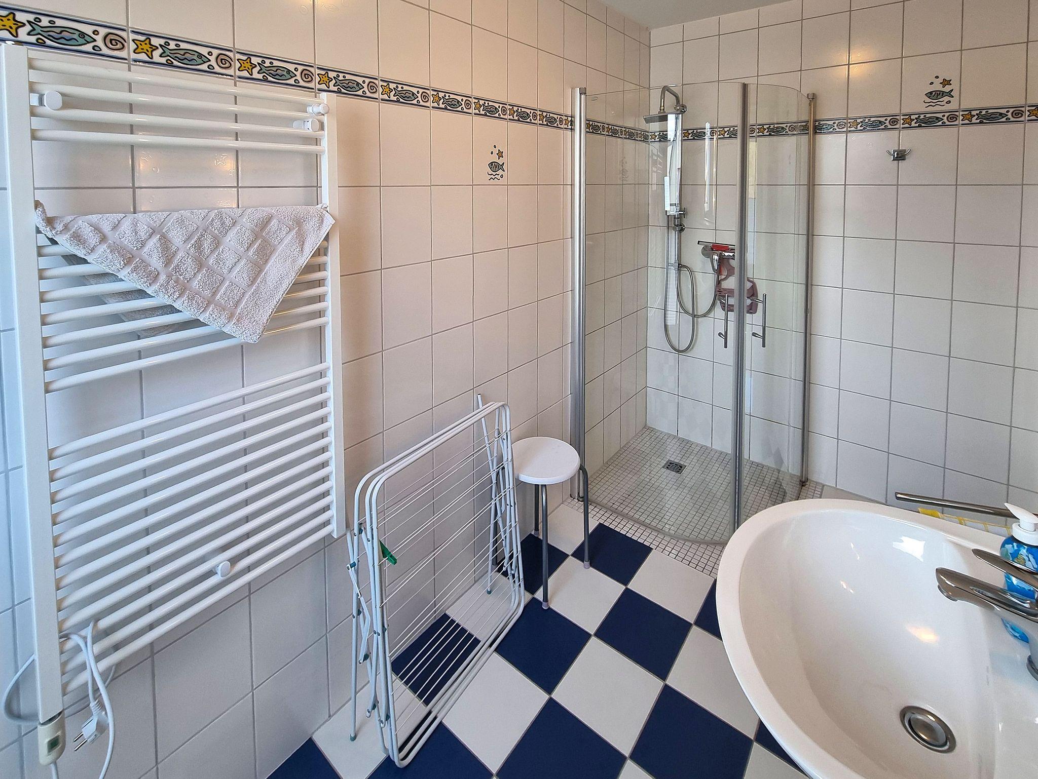 ? Das Bad verfügt über eine ebenerdige Dusche, Waschtisch und WC.