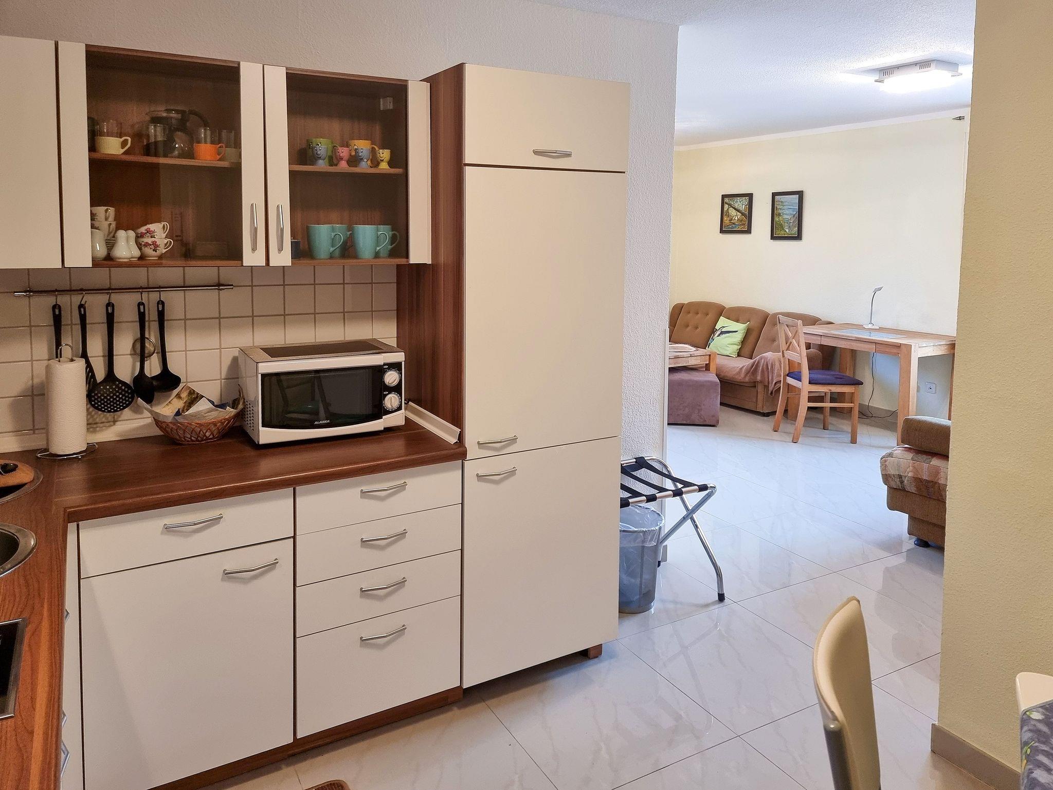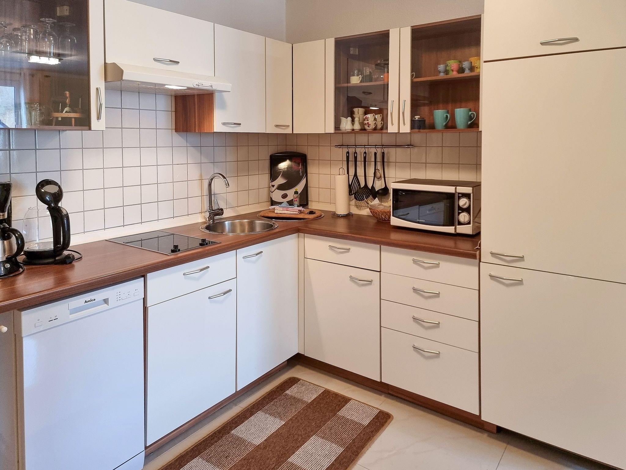 ? Im Eingangsbereich befindet sich die Küche. Diese verfügt über ein 2-Platten-Ceranherd, Mikrowelle, Geschirrspüler, Kaffeemaschine, Wasserkocher, Toaster und Eierkocher. Weiterhin gibt es einen Esstisch mit Stühlen für 4 Personen.