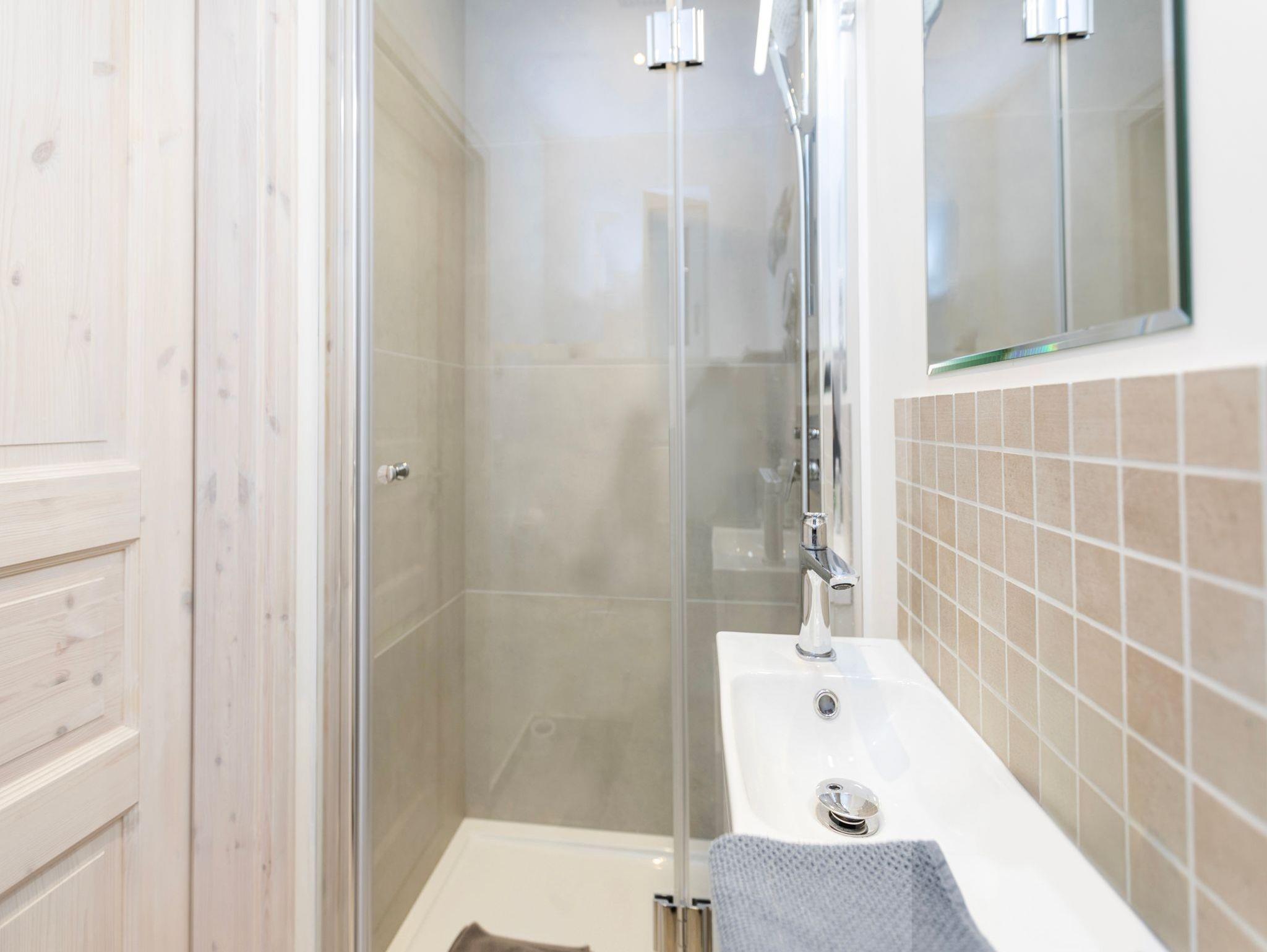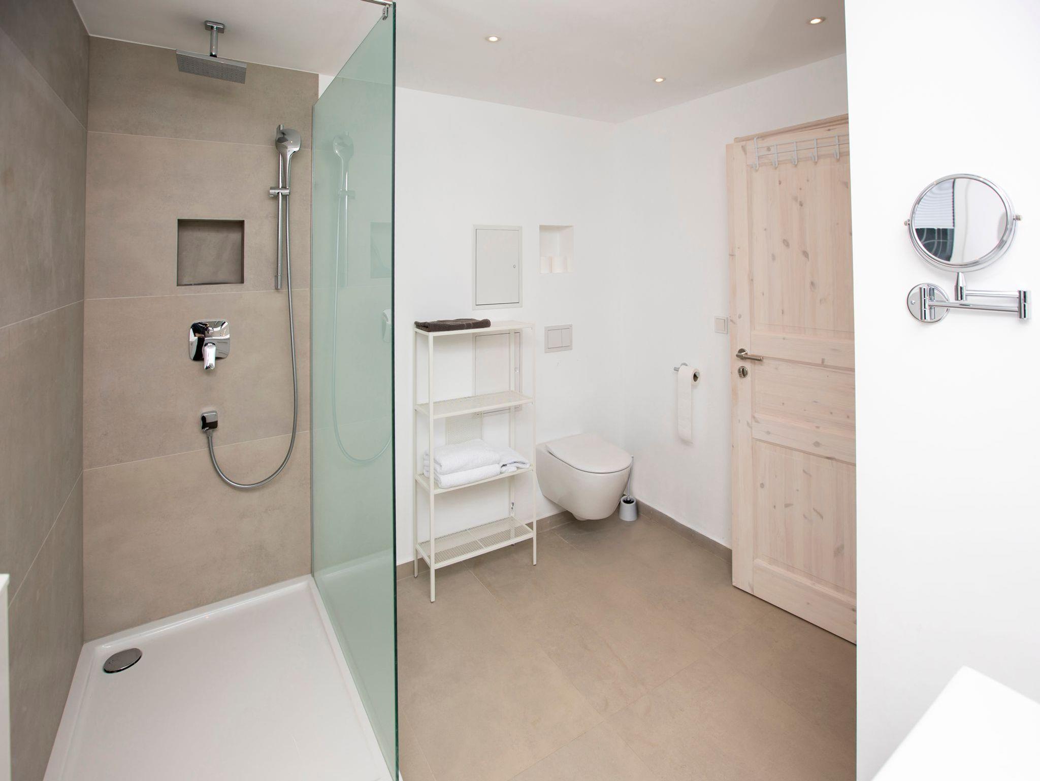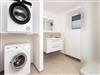• Badezimmer mit Dusche, Waschtisch, WC. Waschmaschine, elektrischem Wäschetrockner, Spiegel, Kosmetikspiegel und Föhn