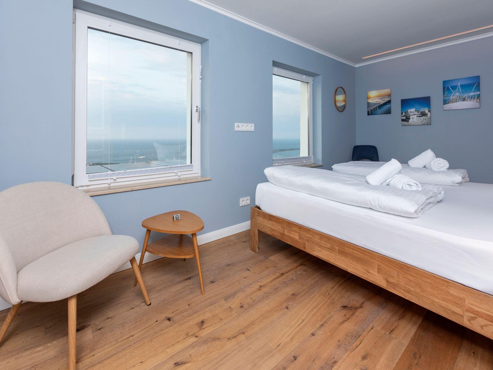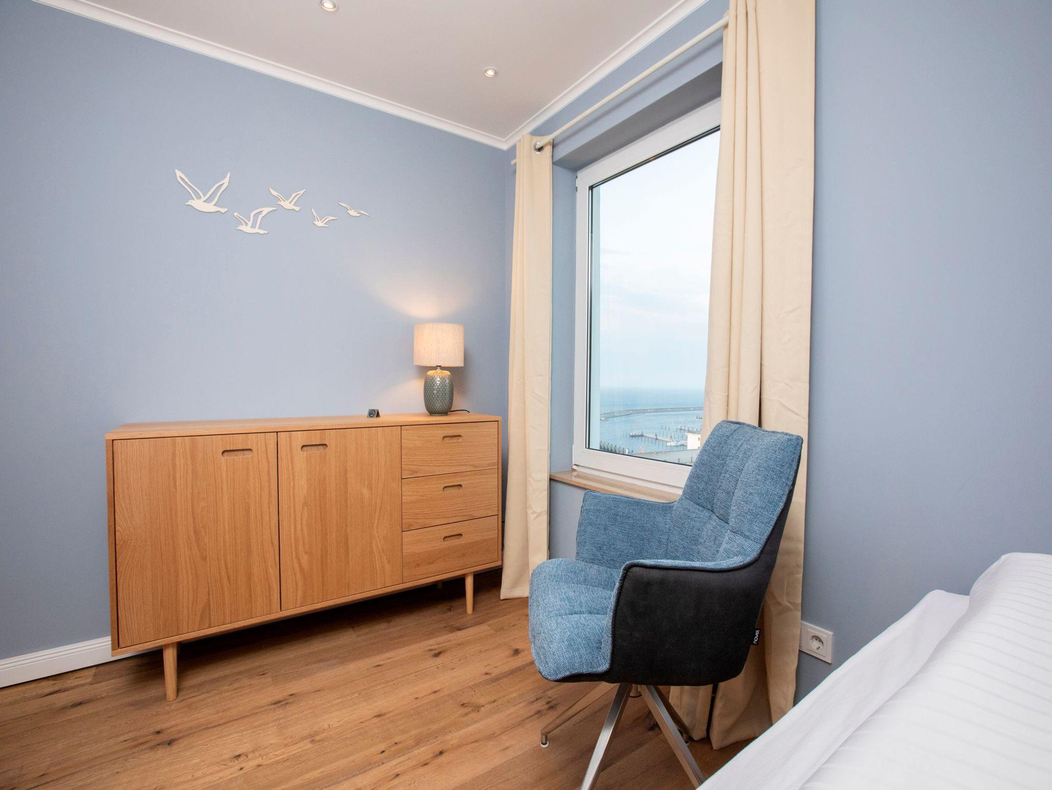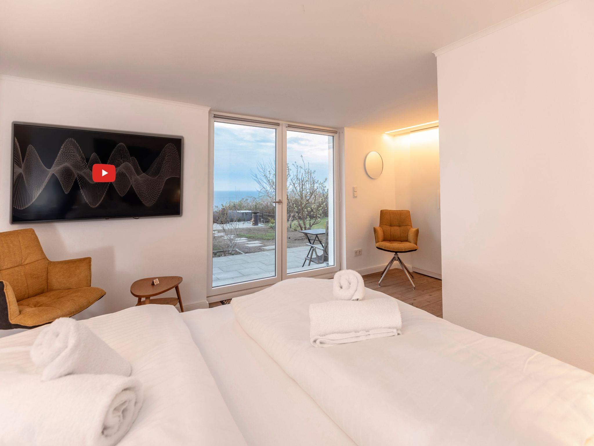 • Schlafzimmer Nr. 4 mit einem Doppelbett (2m x 2m), verstellbaren Lattenrosten, großem Wandschrank, Flachbild-TV, Stuhl und Beistelltisch. Platz für ein Kinderbett. Direkter Meerblick