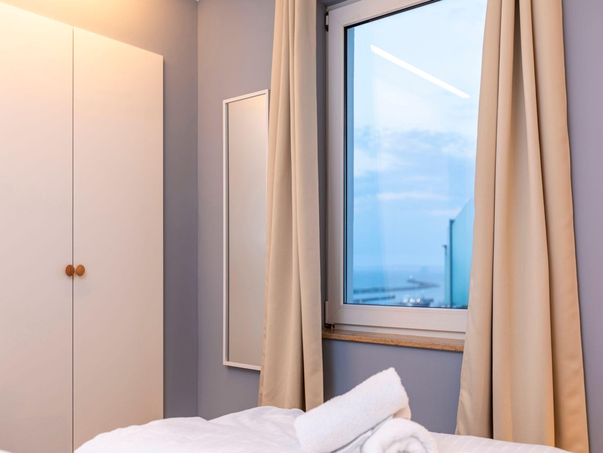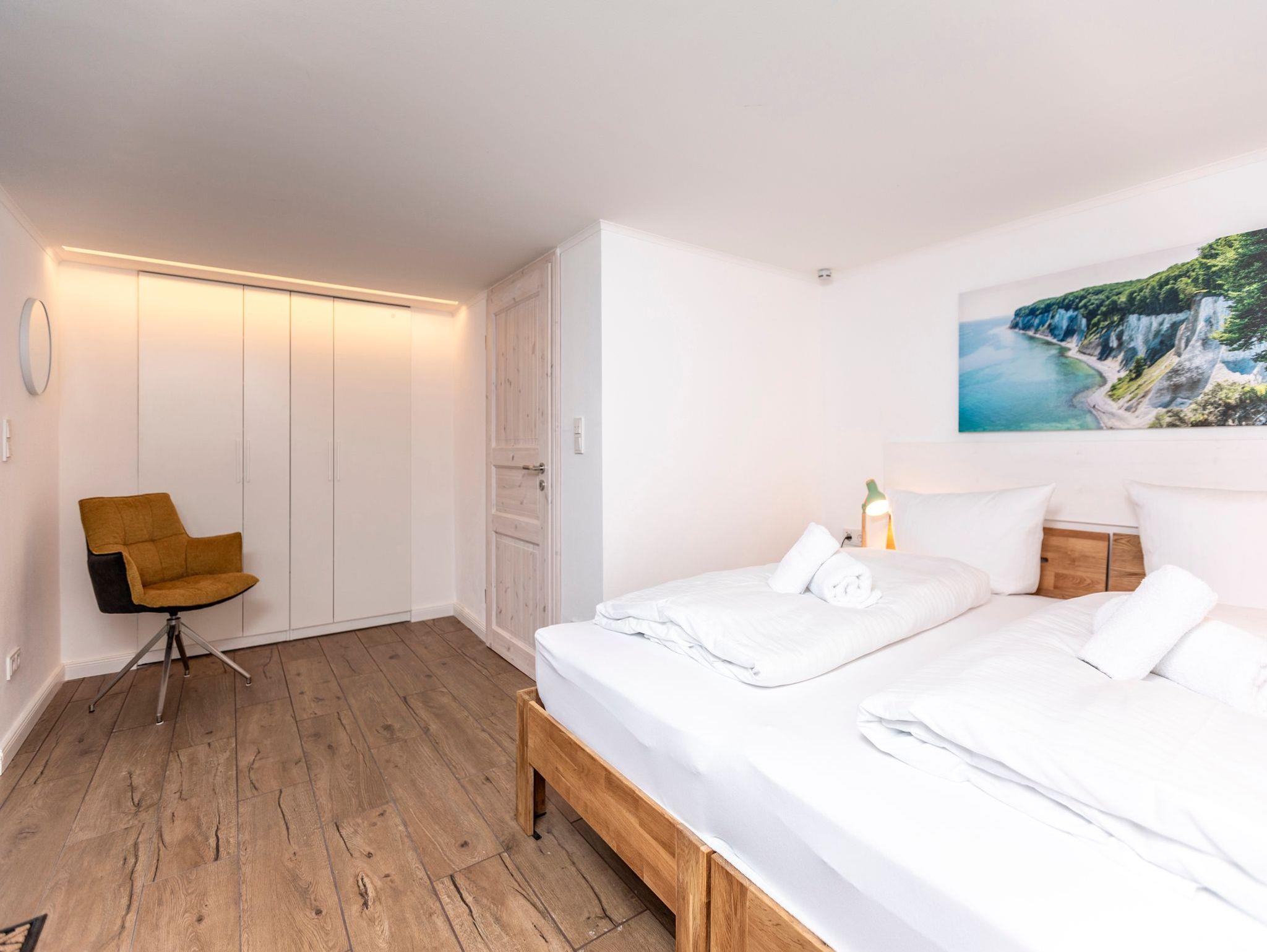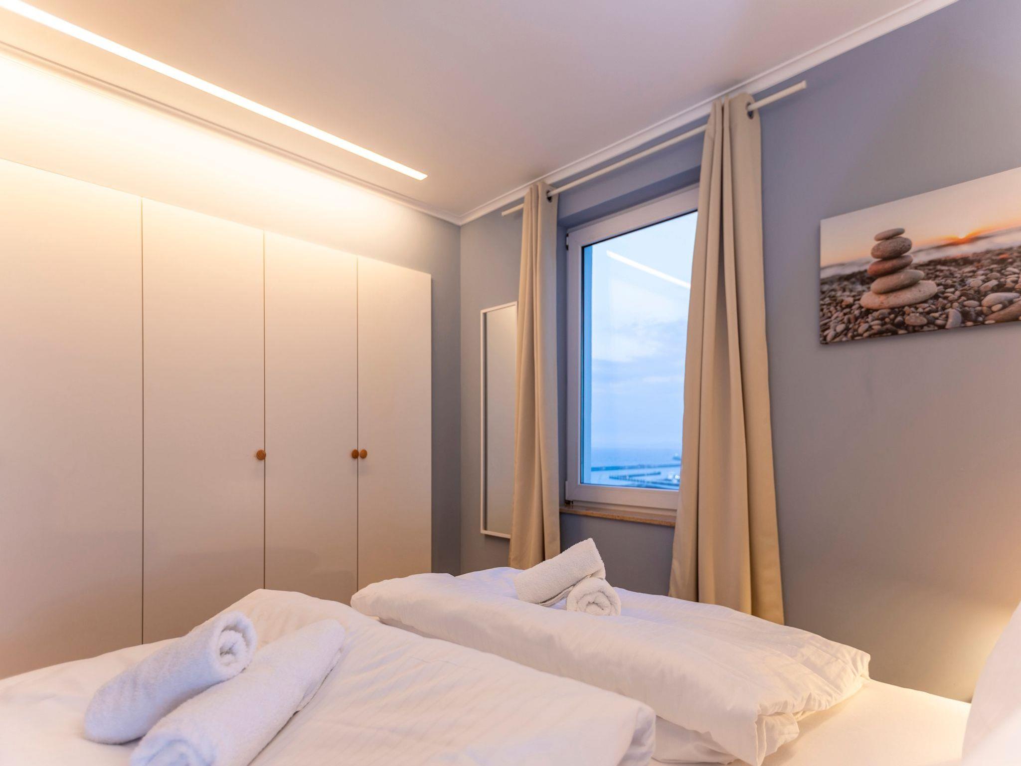 • Schlafzimmer Nr. 4 mit einem Doppelbett (2m x 2m), verstellbaren Lattenrosten, großem Wandschrank, Flachbild-TV, Stuhl und Beistelltisch. Platz für ein Kinderbett. Direkter Meerblick
