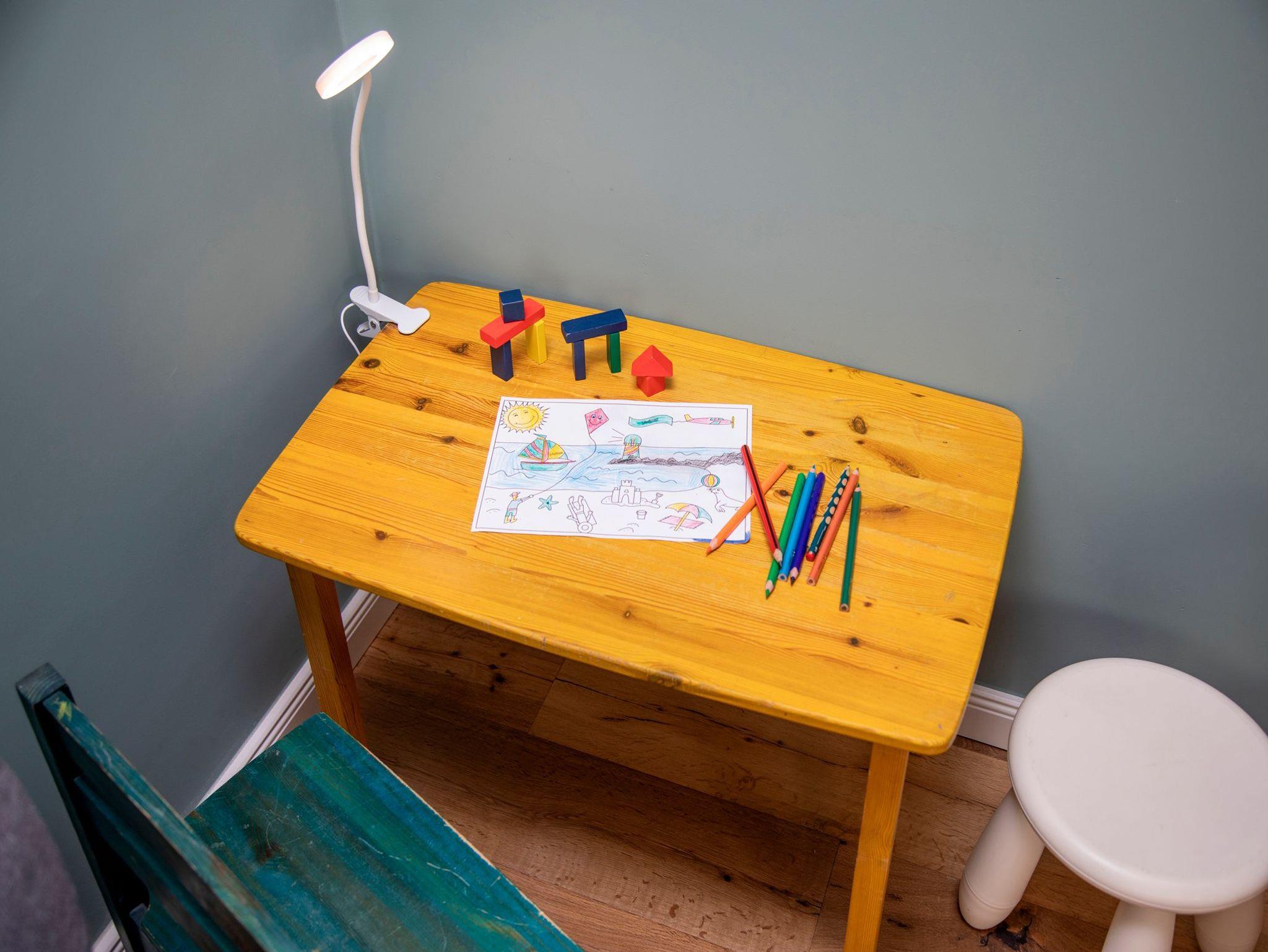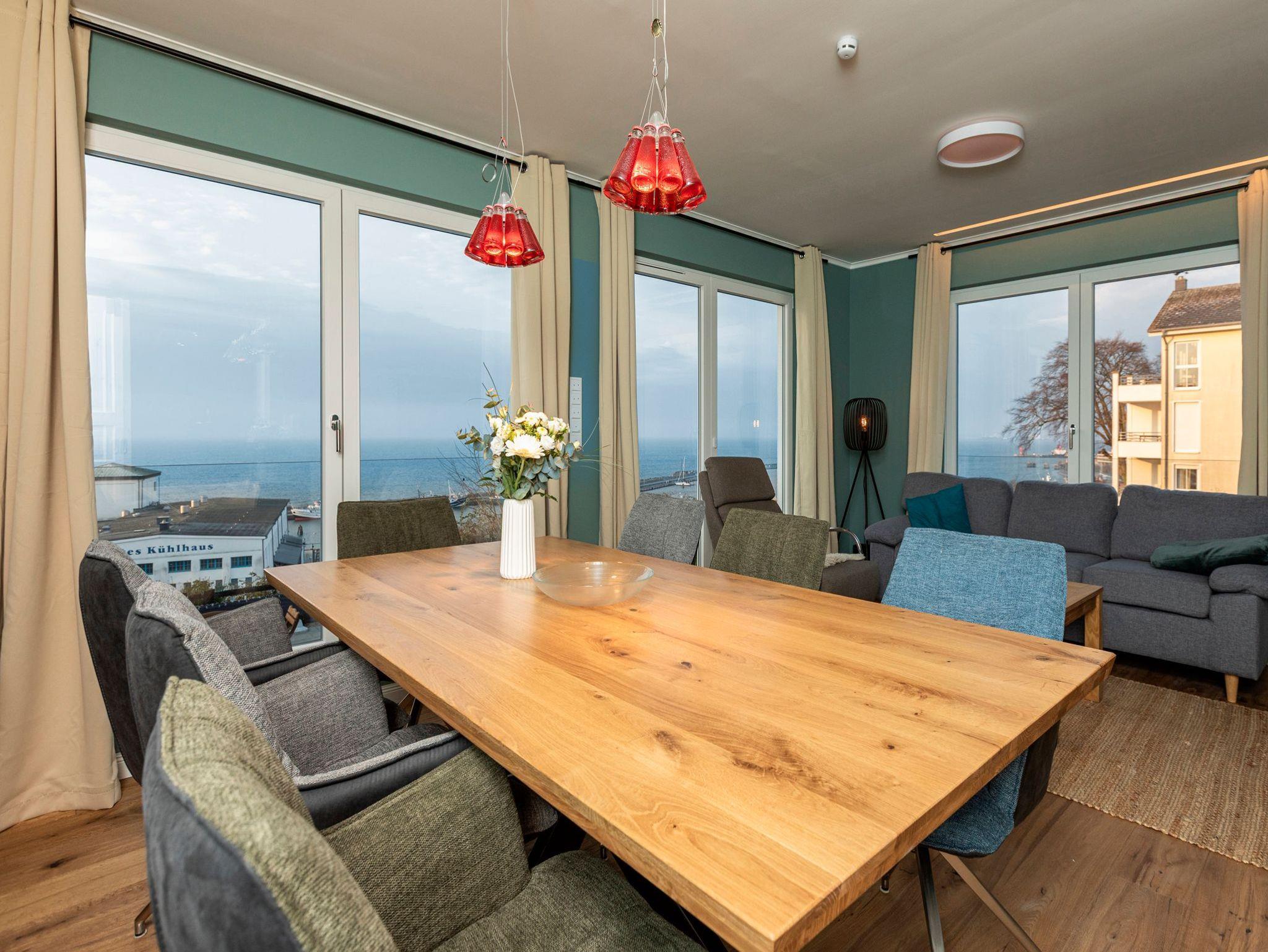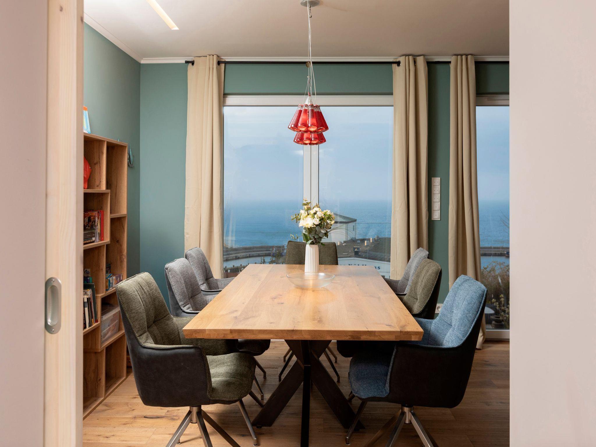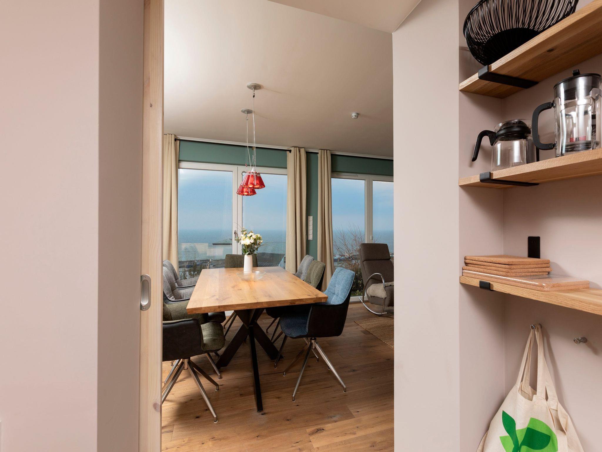 • Wohn- und Esszimmer mit Couch, Schaukelstuhl, Couchtisch, Flachbild-TV, Blu-ray-Player, Spielecke, Hundedecke, Esstisch für 8 Personen, Kinder-Hochstuhl, Regal mit kleiner Bücher-, DVD- und Brettspiel-Auswahl. Direkter Meerblick