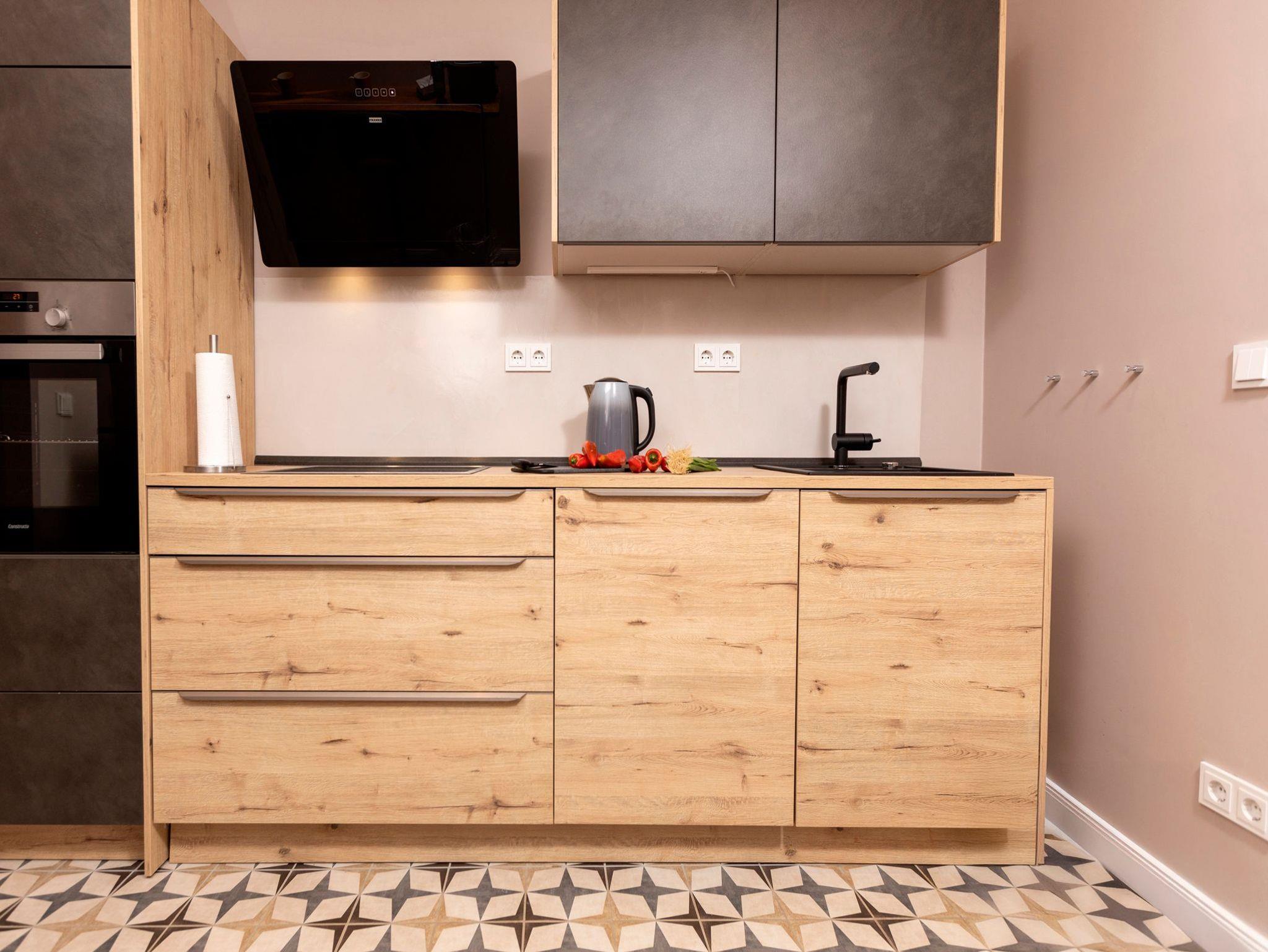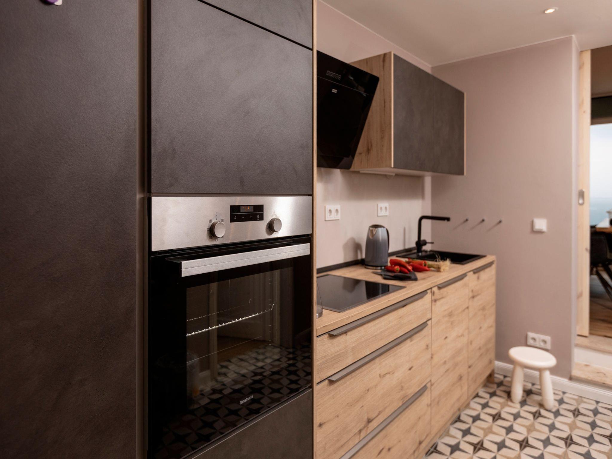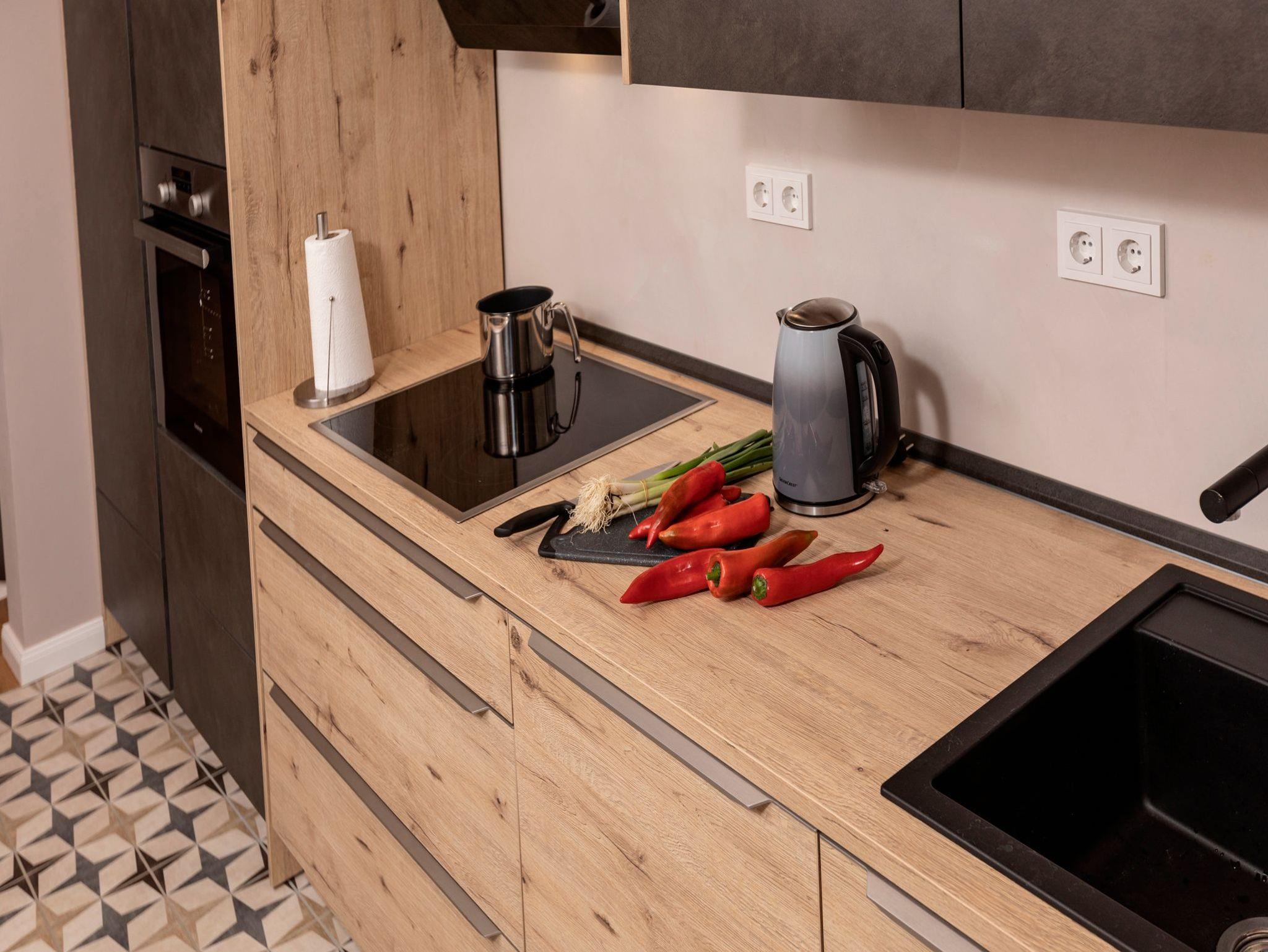 • Küche mit einem 4-Zonen-Kochfeld, Backofen, Mikrowelle, Geschirrspüler, Kühlschrank mit Gefrierfach, Pad-/Kapsel-Kaffeemaschine, Toaster, Wasserkocher und diversem Kleininventar. Ein Küchentresen mit drei Hockern
