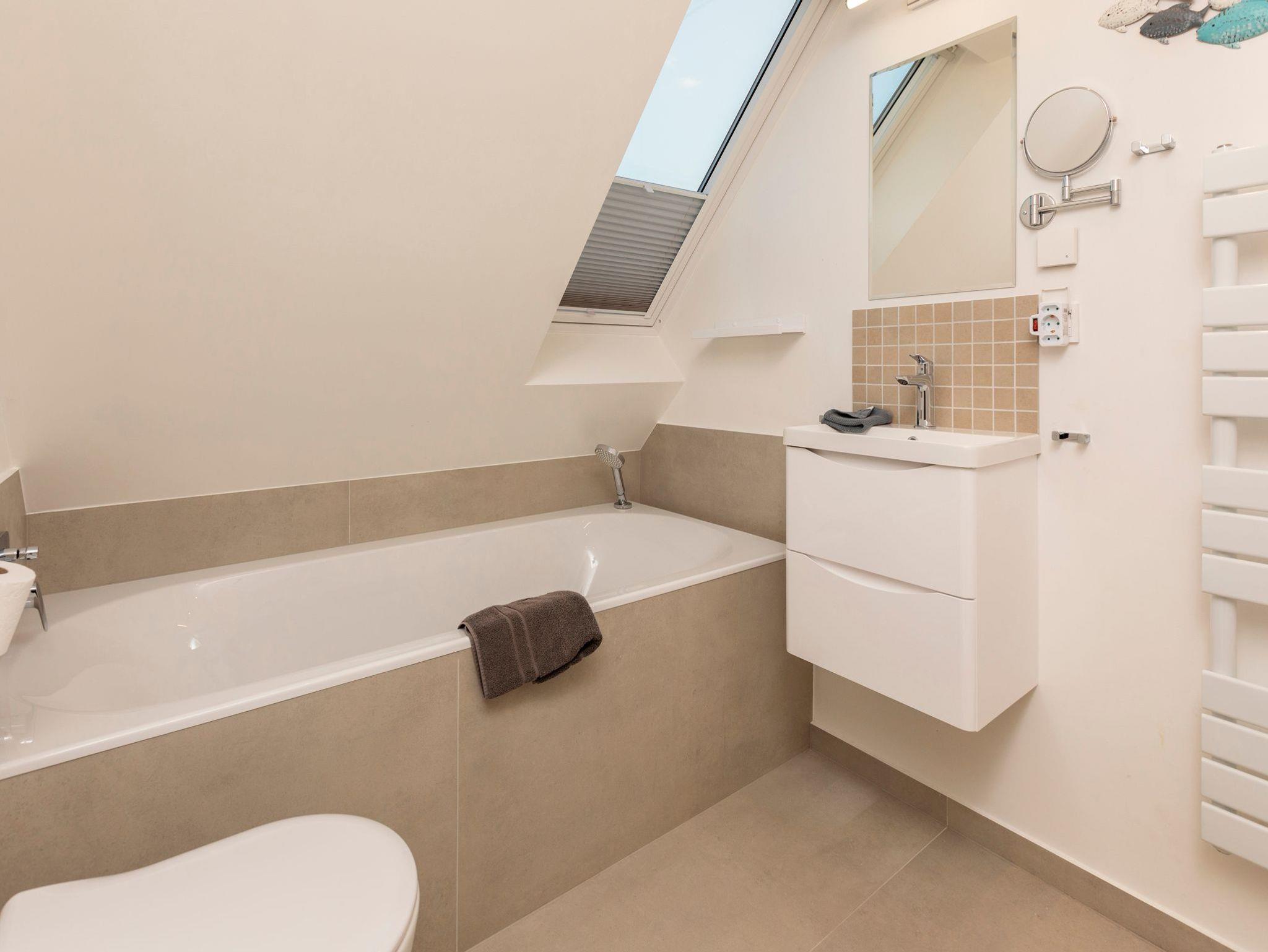 • Badezimmer mit Badewanne, Dusche, Waschbecken, WC und Handtuchheizkörper, Kosmetikspiegel und Föhn