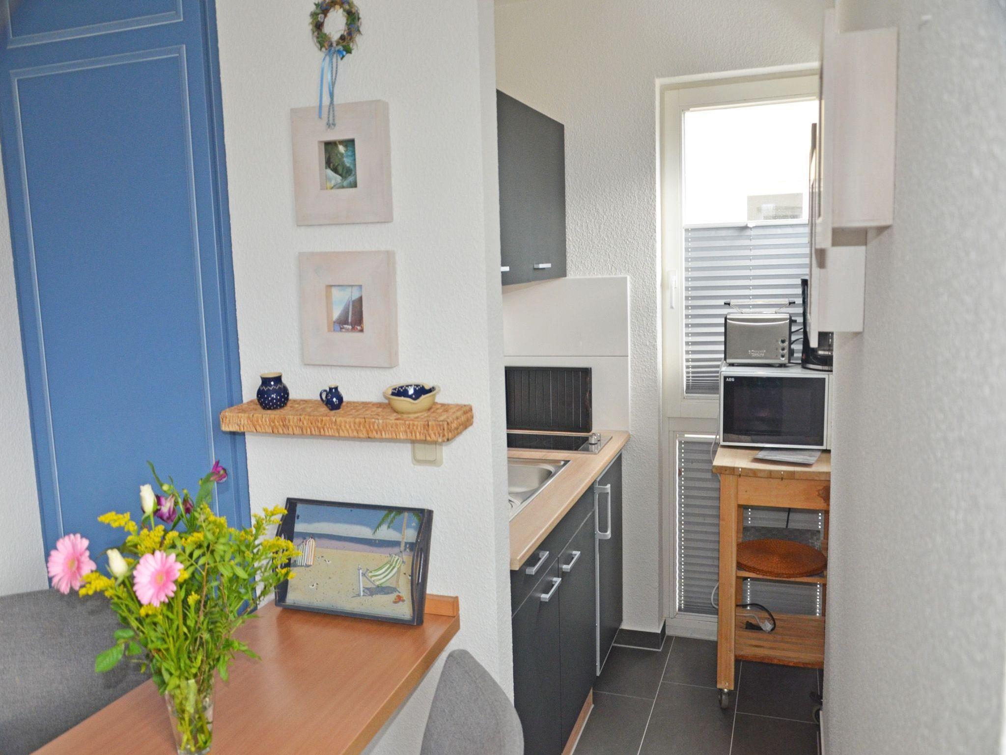 ? Die Mini-Küche ist offen zum Wohnbereich und ausgestattet mit 2-Platten-Ceran-Kochfeld, Mikrowelle, Kaffeemaschine, Toaster, Wasserkocher und diversen Küchenutensilien.