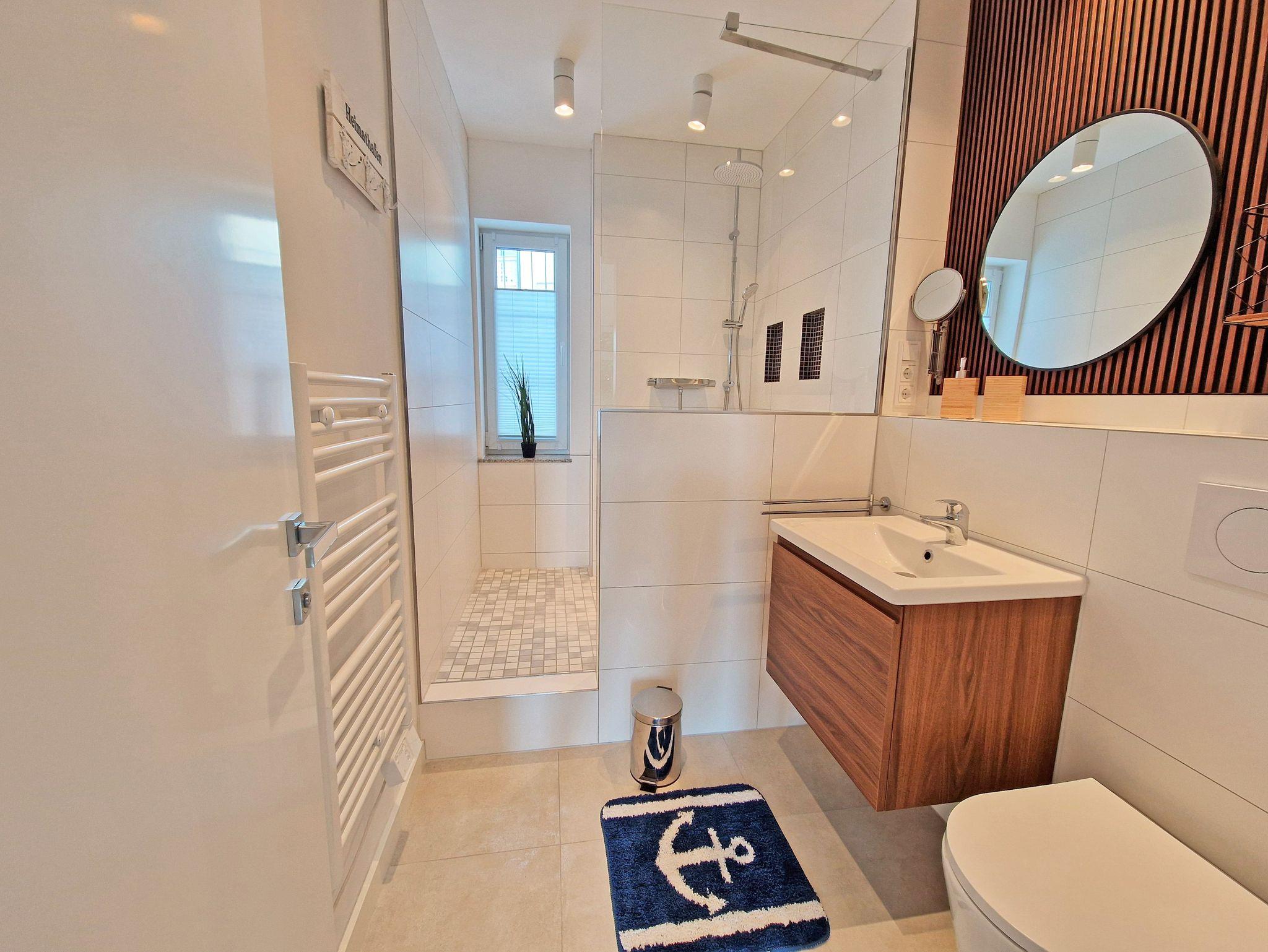 ? Das moderne Badezimmer ist ausgestattet mit bodengleicher Dusche, Regenbrause und WC.