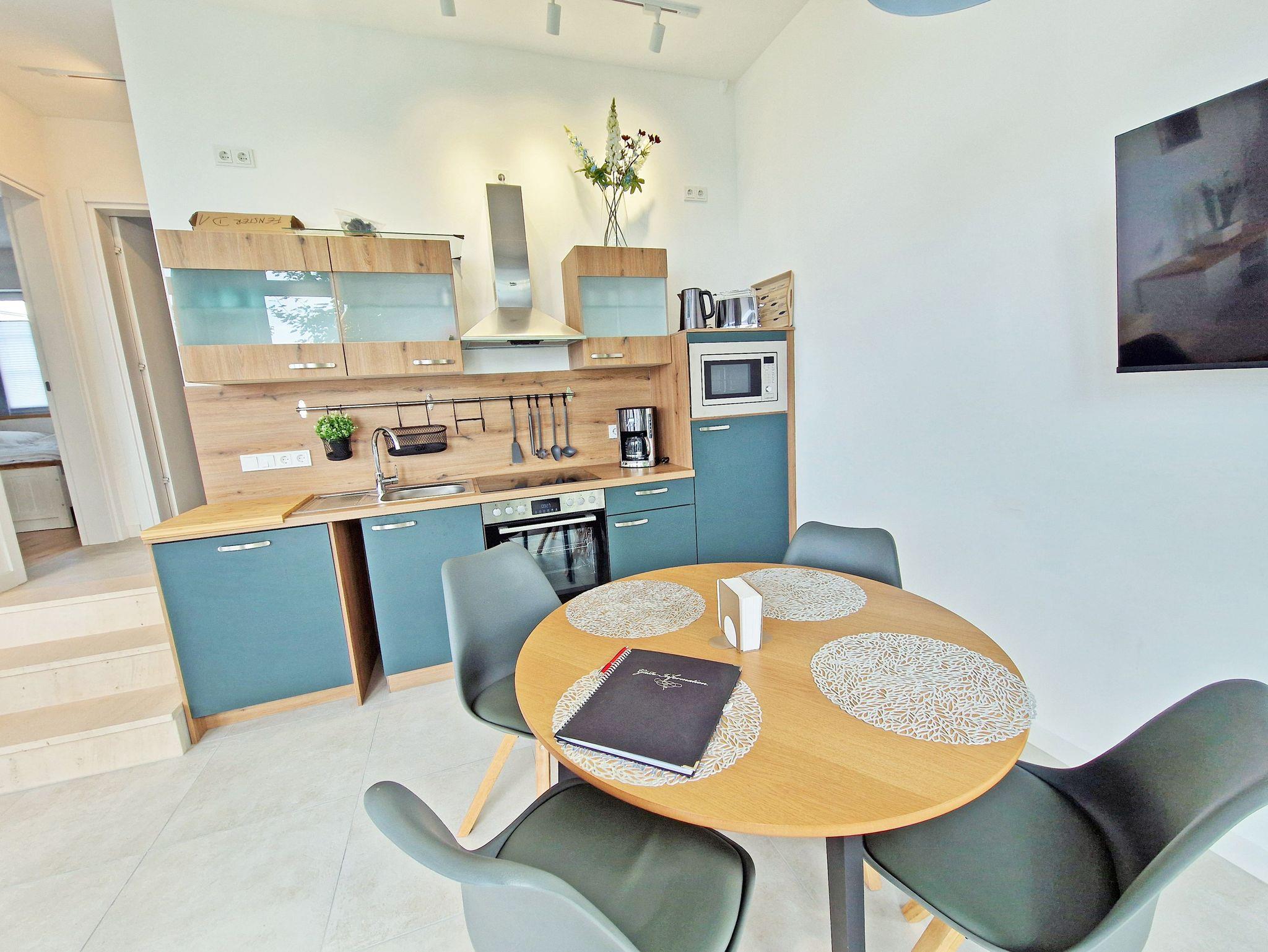 Die Appartements sind durch eine Treppe verbunden. Dadurch besteht die Möglichkeit aus 2 Appartements ein großes Feriendomizil zu machen. Alle Appartements verfügen über eine Fußbodenheizung und einem eigenen Parkplatz. Dieser steht in 300 Meter Entfernung zur Verfügung. Moderne Bäder mit bodengleicher Dusche und Wellnessbrause sowie eine komplett und hochwertig eingerichtete Küche warten auf Sie. Auf dem Balkon bzw. Terrasse laden elegante Möbel zum Sonnen und Verweilen ein. Am Haus befinden sich Fahrradständer die zur Verfügung stehen.