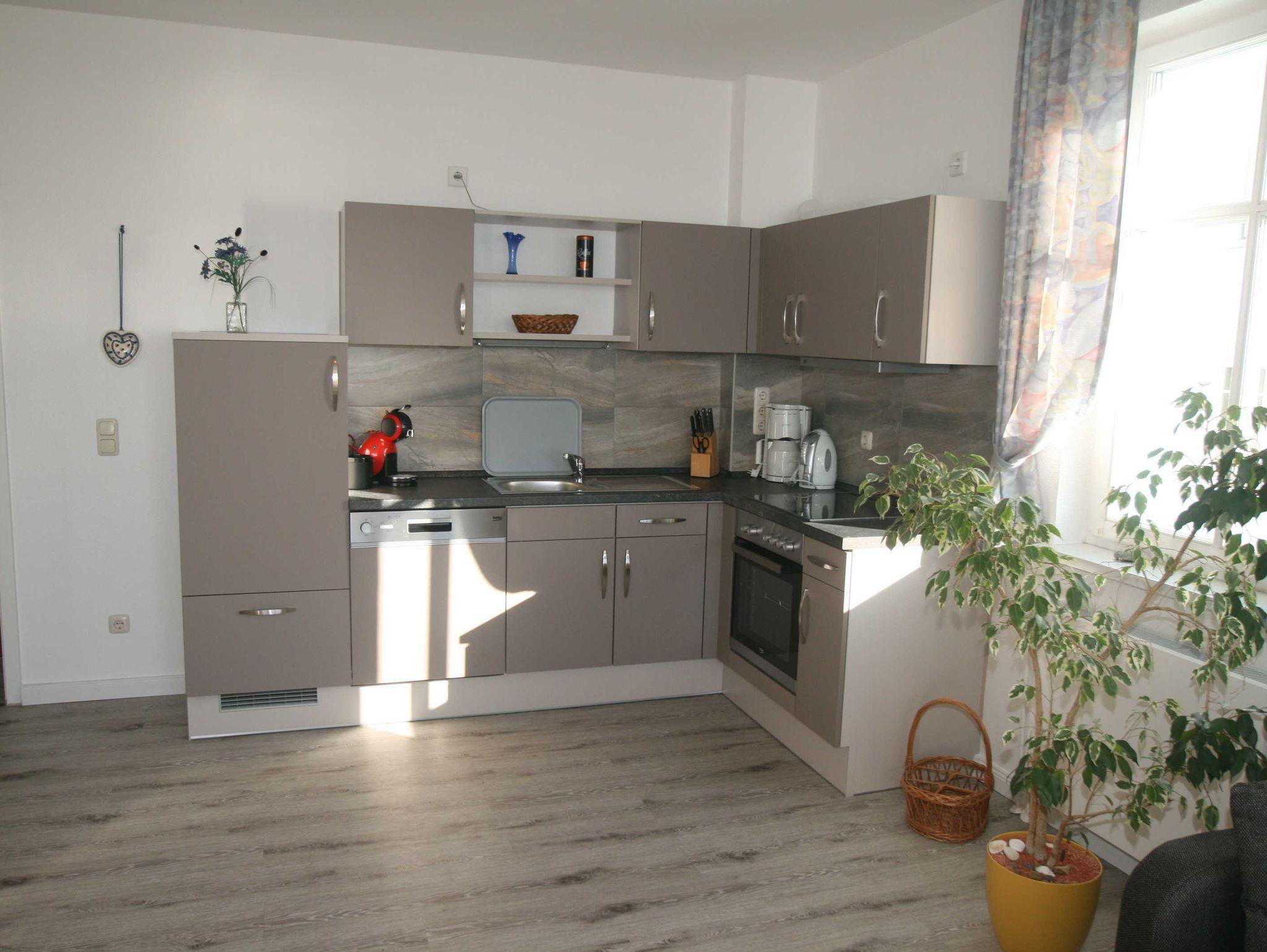 Ausserdem gibt es ein grosses Wohnzimmer mit einer komplett ausgestatteten Einbauküche mit Eierkocher, Filterkaffemaschine, Kaffepadmaschine, Toaster, Wasserkocher, 4 Platten-Cerankochfeld, Backofen,Kühlschrank, Geschirrspülautomat, ausreichend Geschirr und Besteck, Salz und Pfeffer, Zucker, Geschirrtuch, u.v.m.