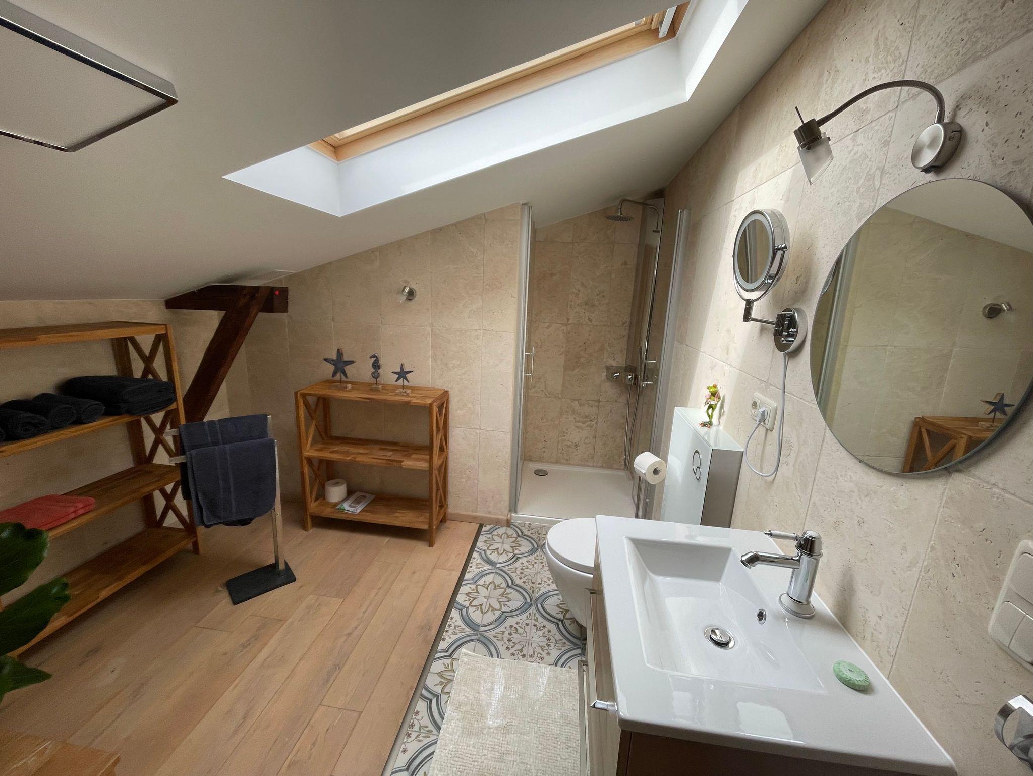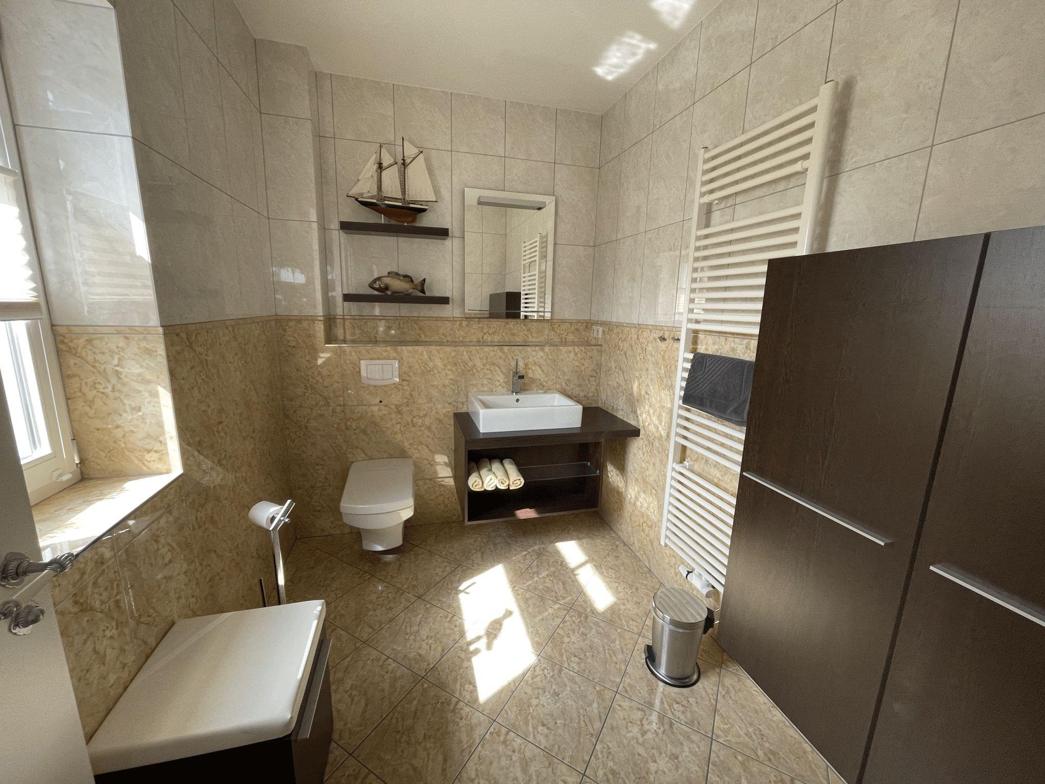 • Ein liebevoll eingerichtetes Badezimmer mit Dusche/WC und Waschtisch. Ein zusätzliches Gäste-WC befindet sich im Erdgeschoß.