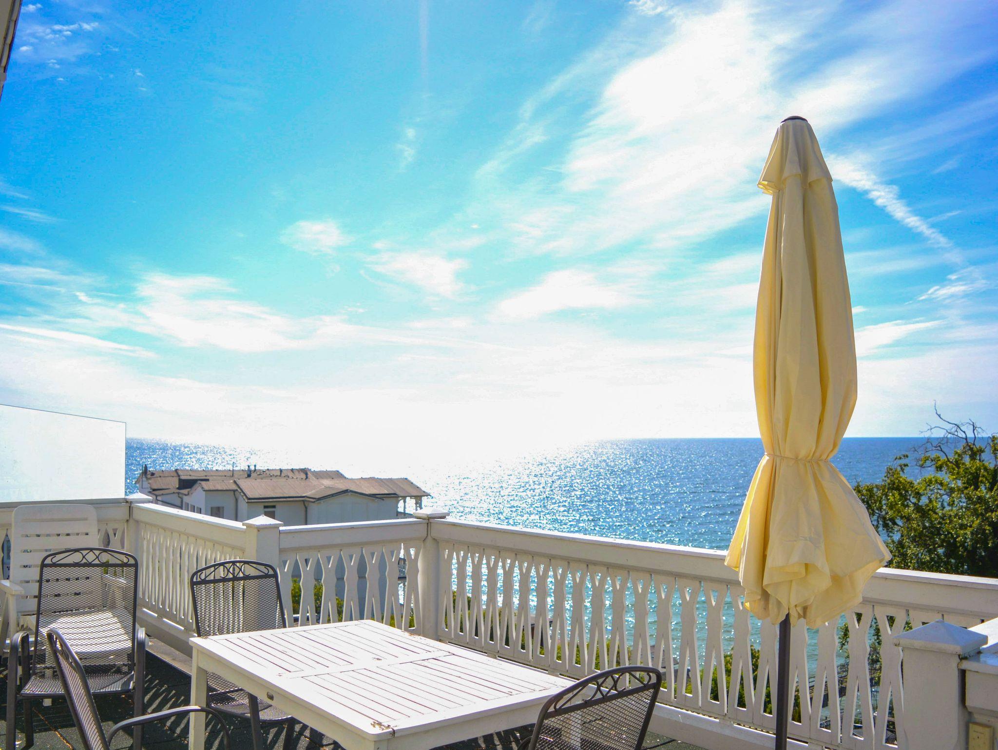 Die Villa wurde 1880 im Gründerzeitstil erbaut. 1994 wurde sie stilgerecht und liebevoll restauriert. Die 72 m² Ferienwohnung in der Villa befindet sich in traumhafter Lage, oberhalb der Strandpromenade von Sassnitz, mit Panoramablick auf die Ostsee. Genießen Sie den einmaligen Blick auf die Ostsee und den Hafen von der 24 m² großen Panorama-Dachterrasse. Die 72 m² große Ferienwohnung hat ein Schlafzimmer, ein großes Bad mit Dusche, eine kleine separate Küche, ein Wohnzimmer sowie ein Esszimmer mit Zugang zur großzügigen Dachterrasse mit Panoramablick auf Hafen und Ostsee. Die Küche ist ausgestattet mit Backofen, Herd, Mikrowelle, Kühlschrank, Kaffeemaschine und Toaster. Im Schlafzimmer gibt es ein großes Doppelbett. Im Esszimmer steht eine Schlafcouch als Aufbettung für 2 Kinder bis 16 Jahre bereit.
