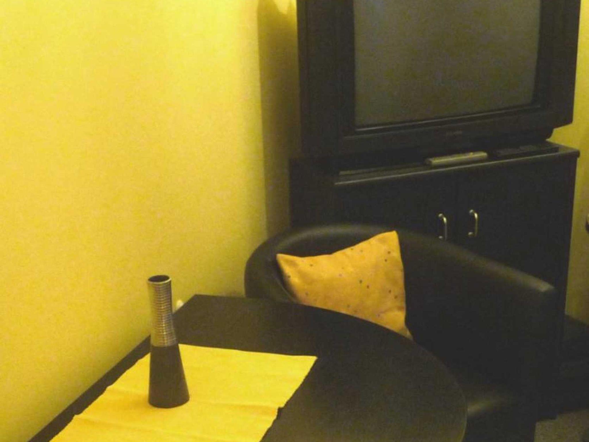 Sat-Flachbild-TV, Radiowecker und elektrische Rollläden vor den doppelflügeligen Balkontüren.