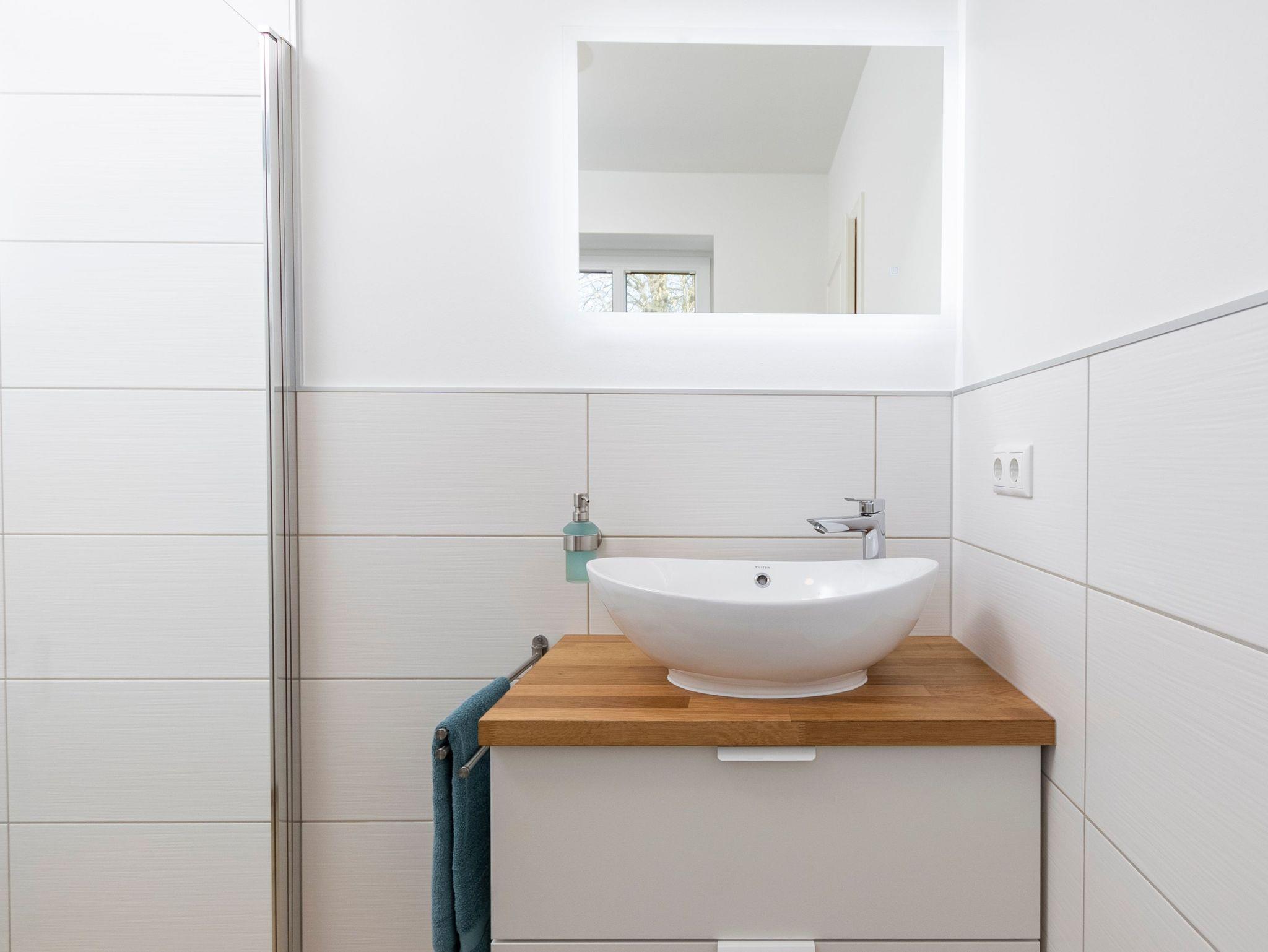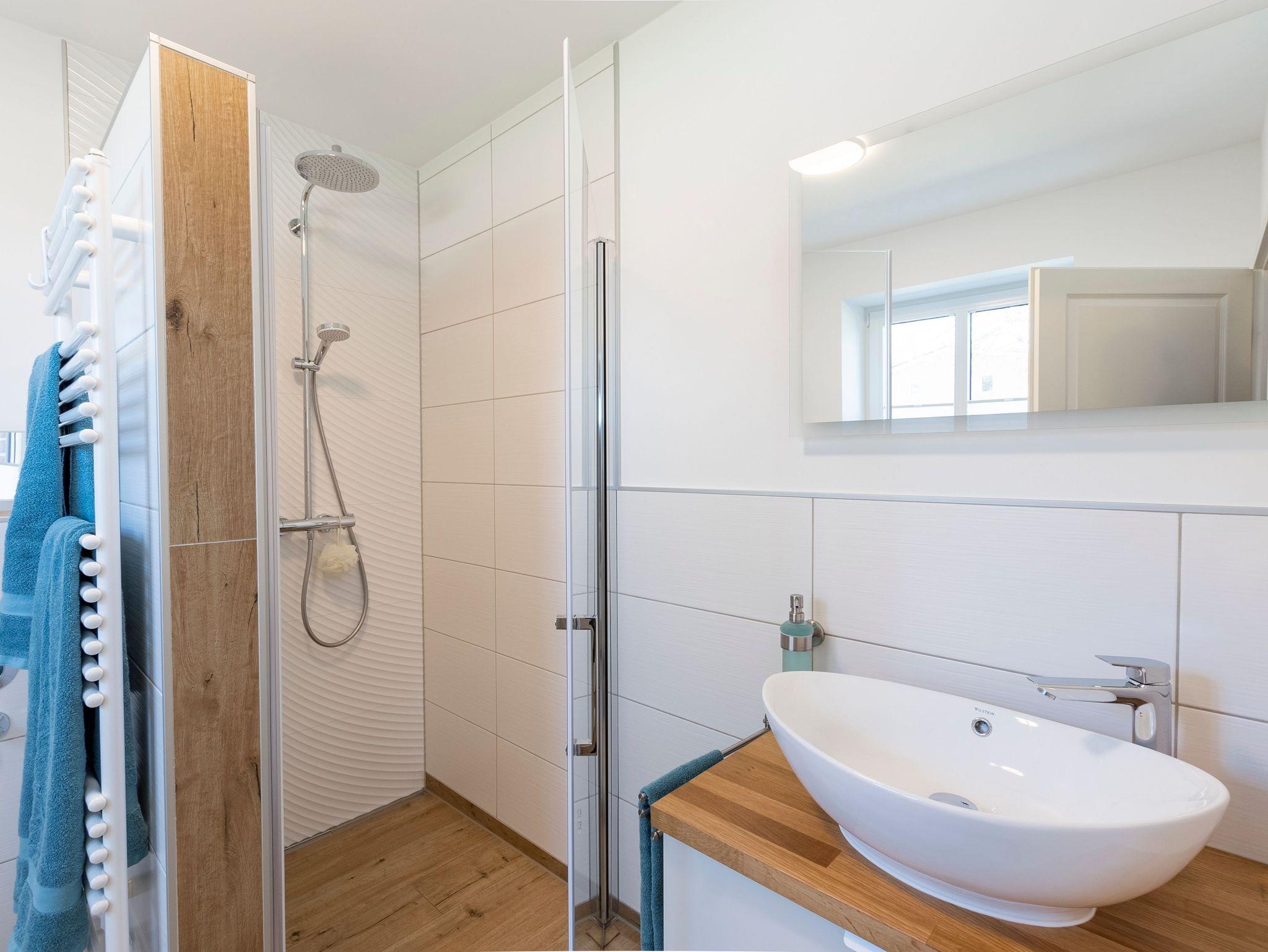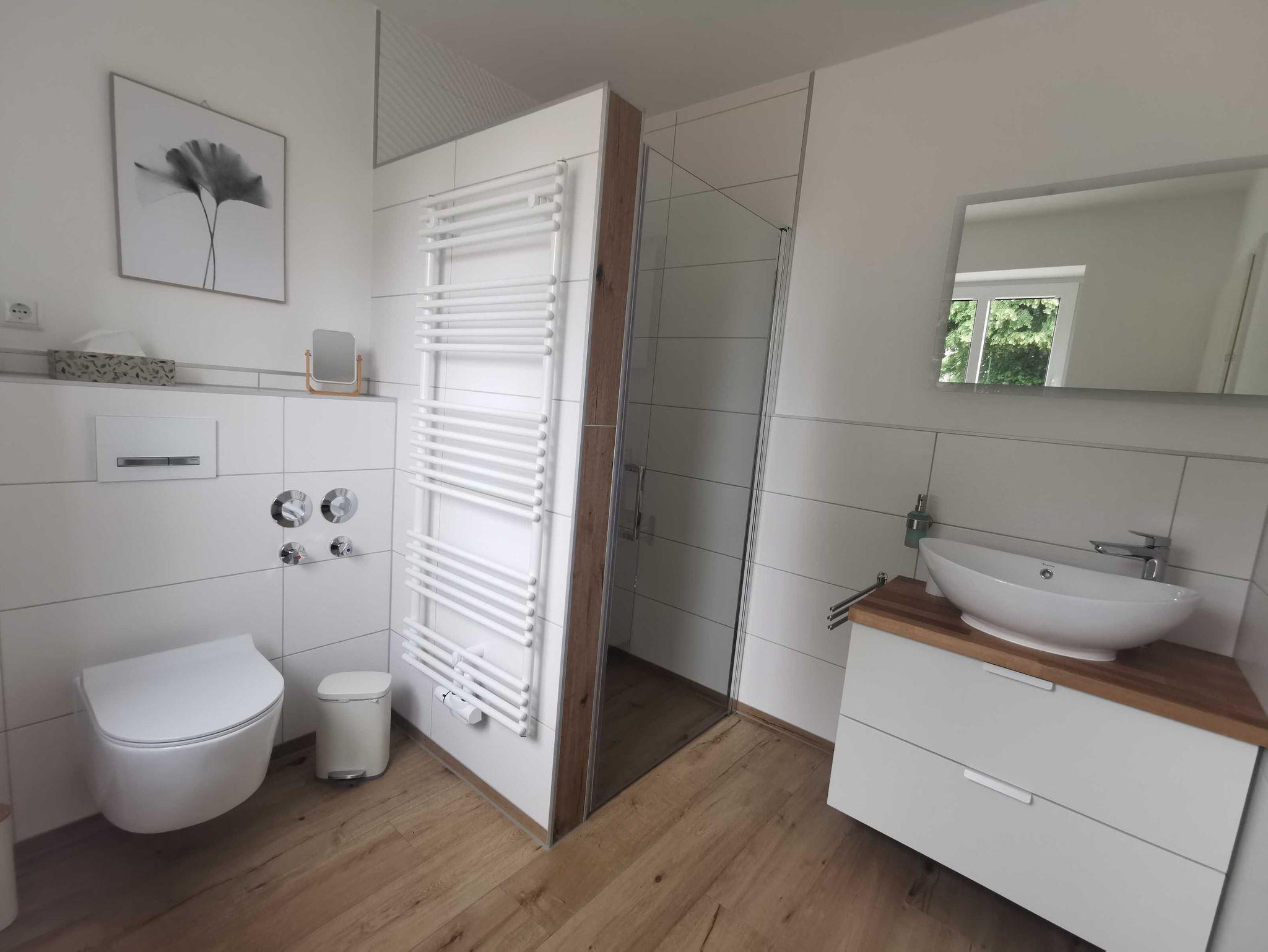 Das Tageslichtbad ist mit einer ebenerdigen Dusche ausgestattet.