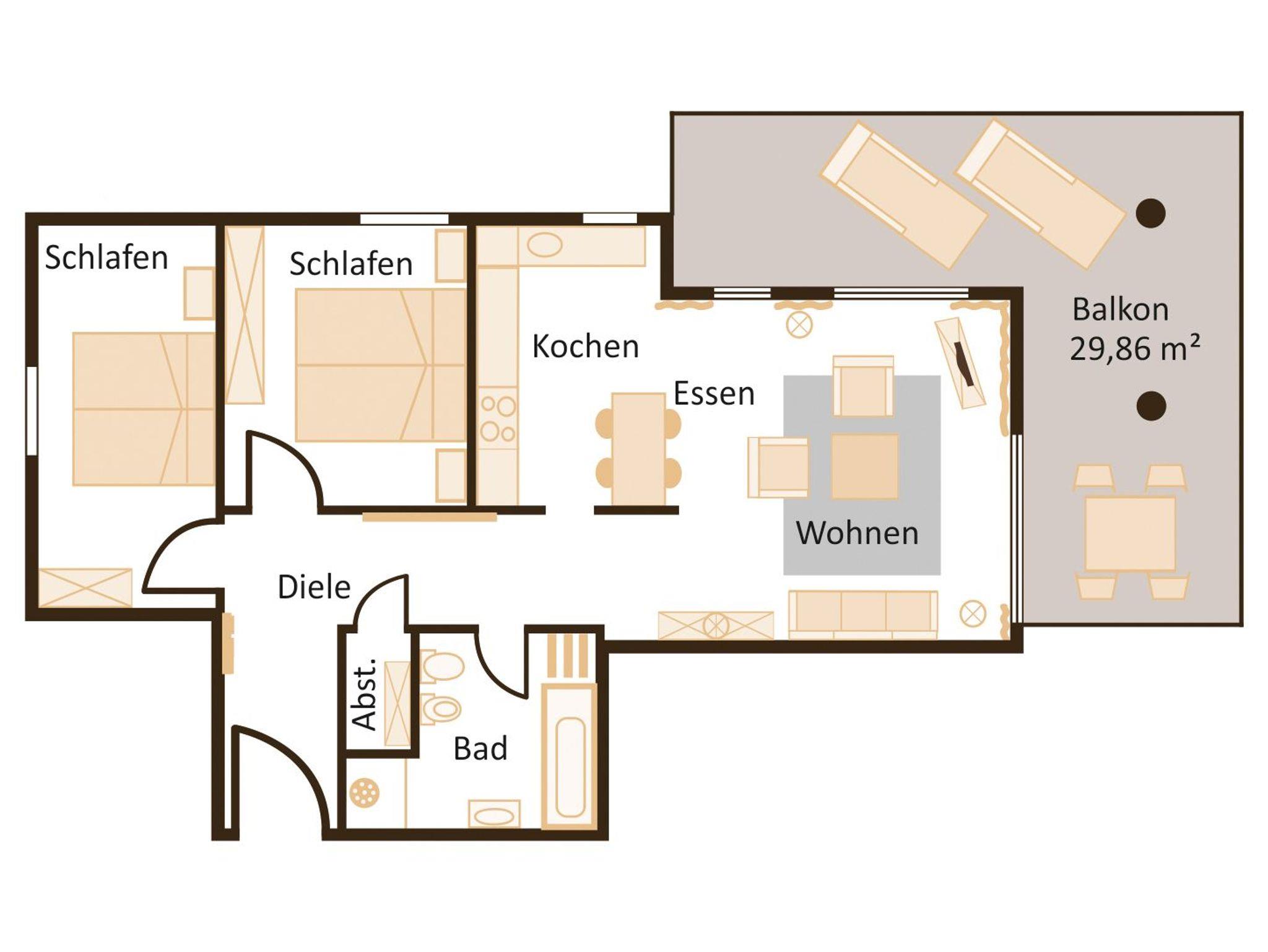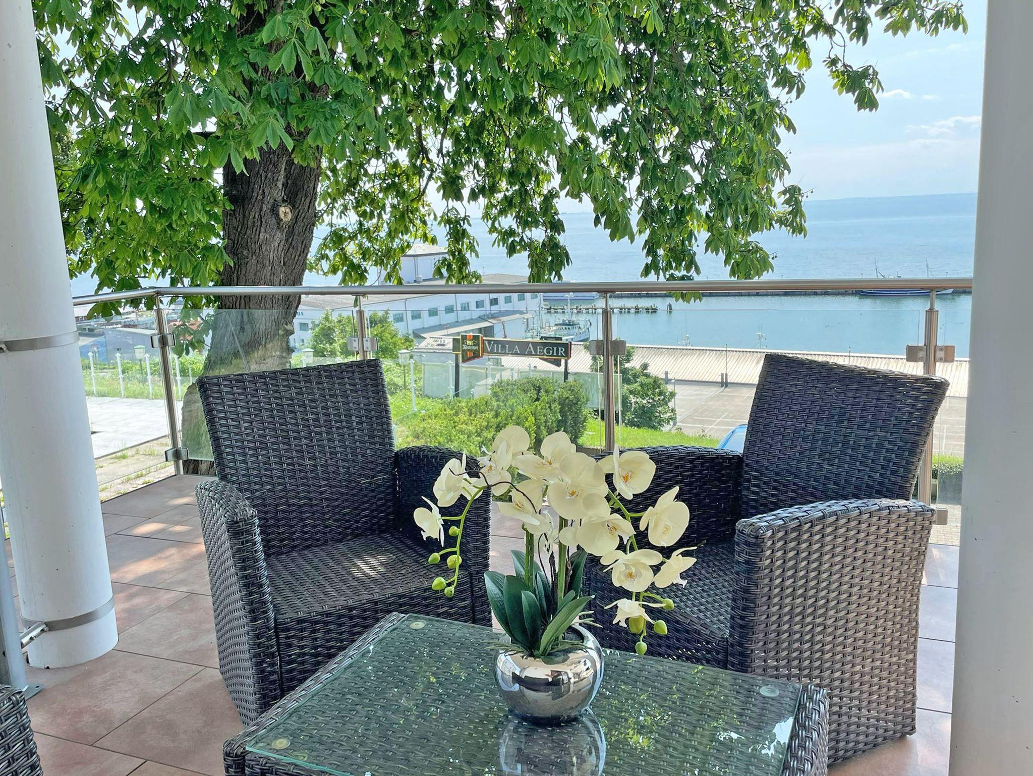 ? weitläufiger Seeblick vom Süd-Balkon (30 m²) mit Balkonmöbel.