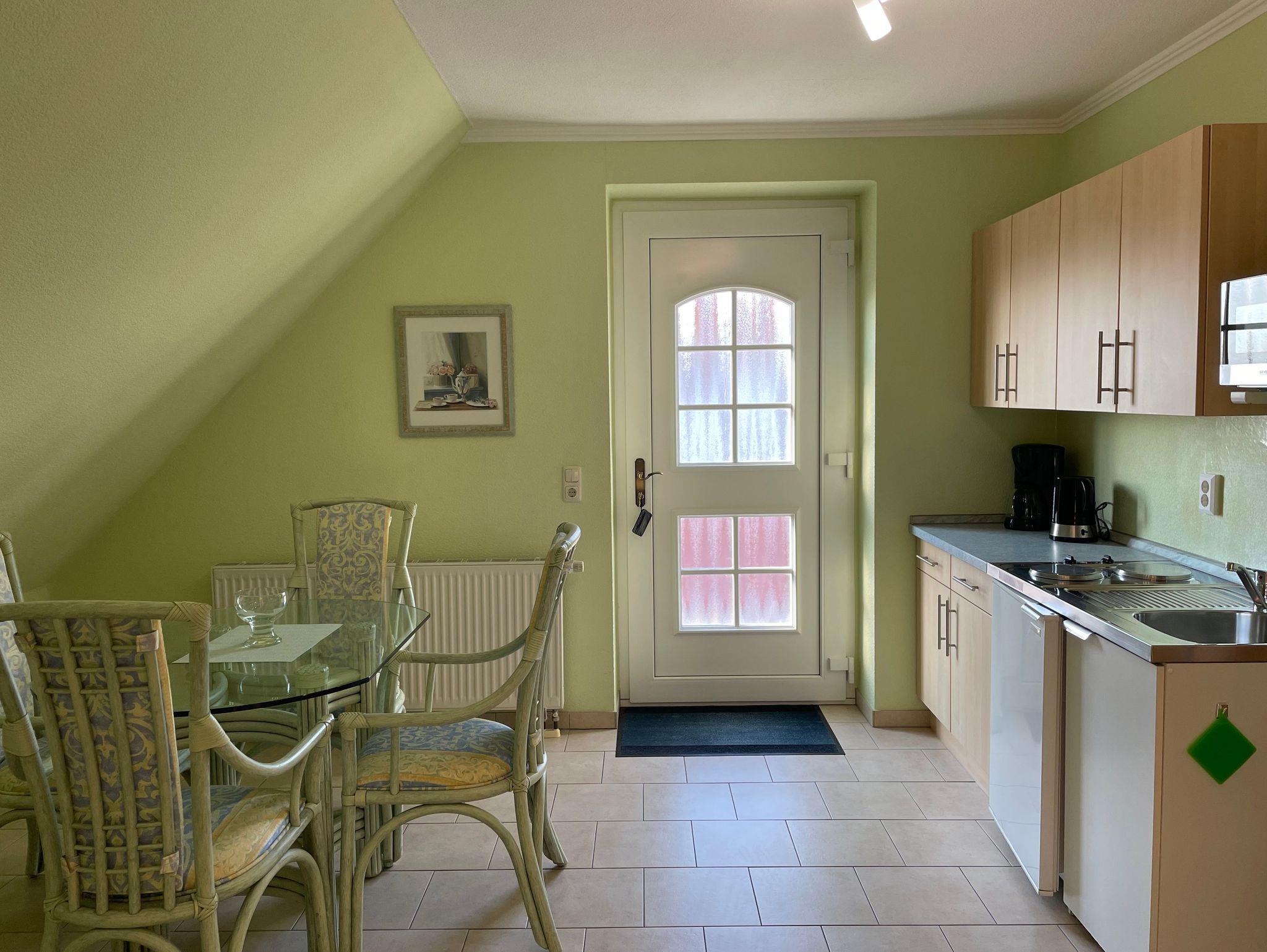Eingang über eine sep. Treppe an der Hausseite direkt in den Küchenbereich mit Sitzecke, Küchenzeile und Aufbettung für eine 3 Person auf einem Schlafsessel. Das sonnige Wohn- und Schlafzimmer verfügt über eine Schlafcouch, einen großen Kleiderschrank, TV und einem große Balkon zur Südseite, von dem Sie den traumhaften Sonnenuntergang genießen können.