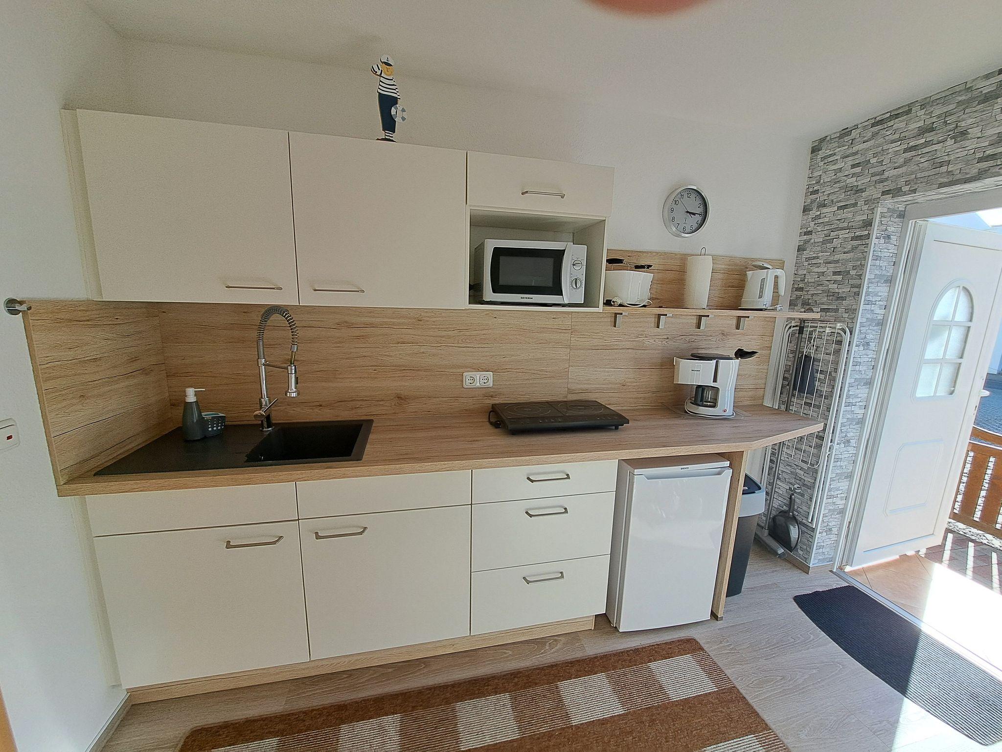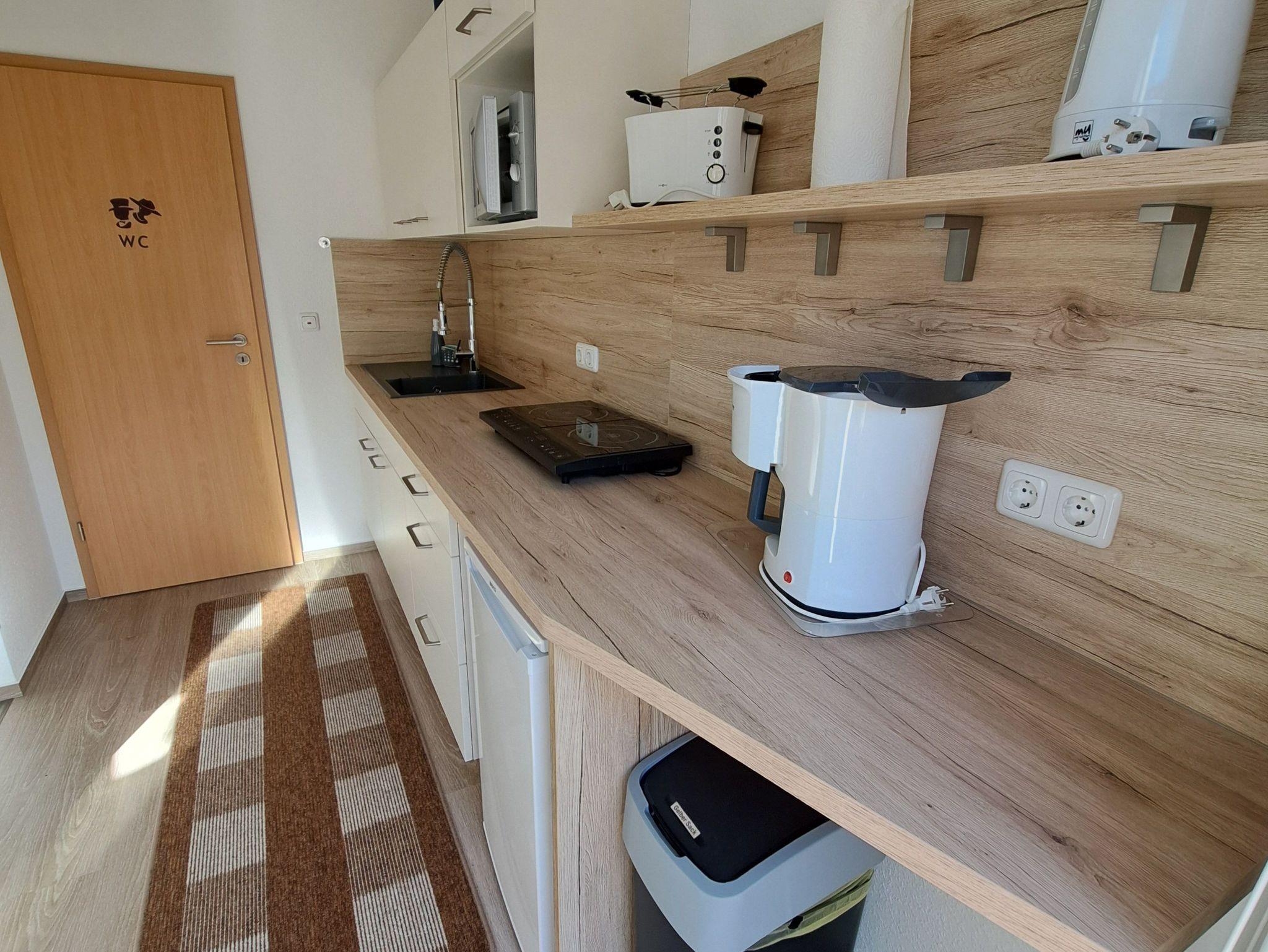 ? Die separate Küche mit kleinem Essbereich bietet folgende Ausstattung: 2 Platten-Induktionsherd, Kühlschrank, Mikrowelle und diverse Küchenutensilien.