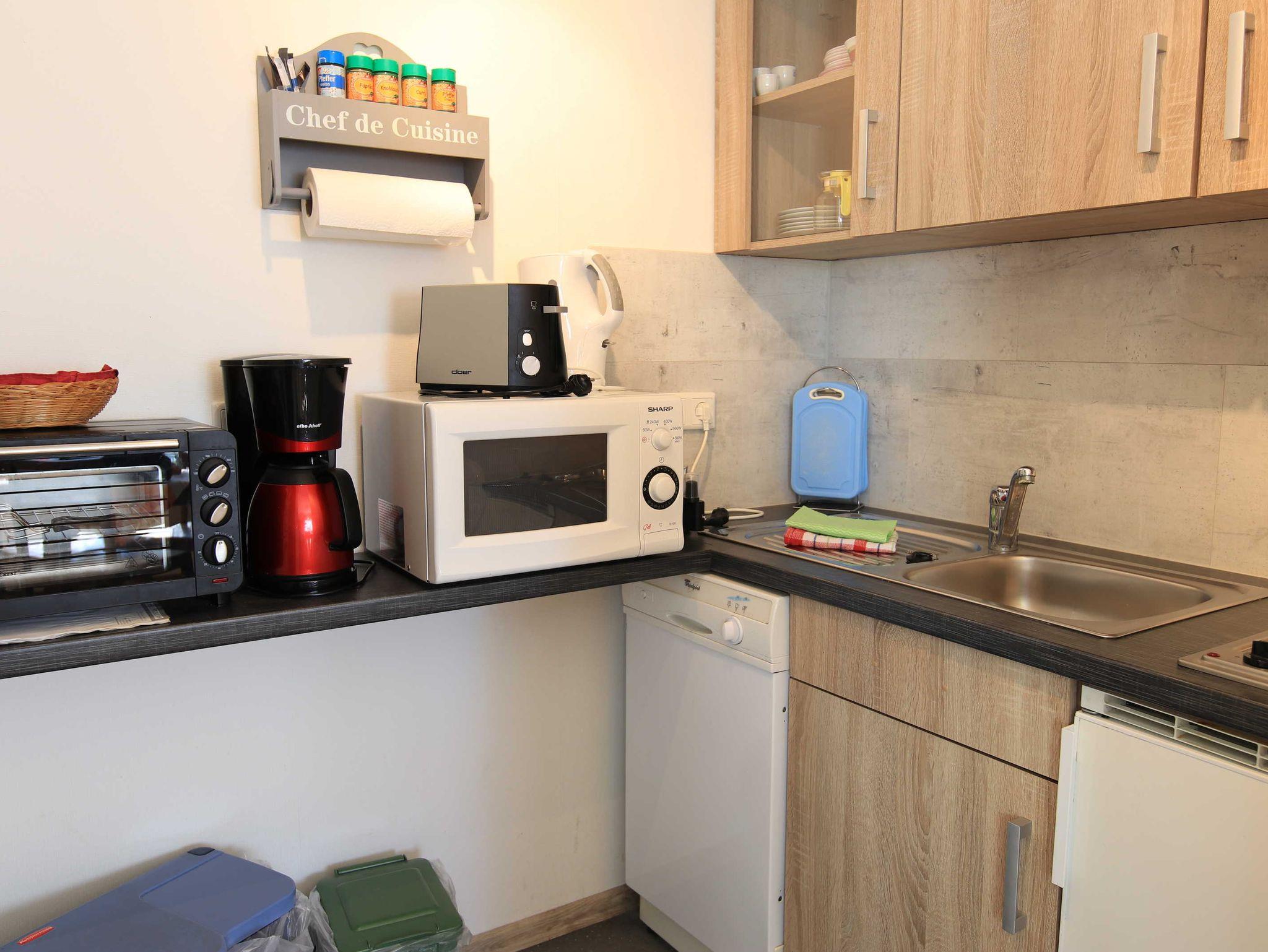 Die Küche ist komplett eingerichtet mit Mikrowelle, Kühlschrank, Herd, Wasserkocher, Airfryer, Eierkocher etc.