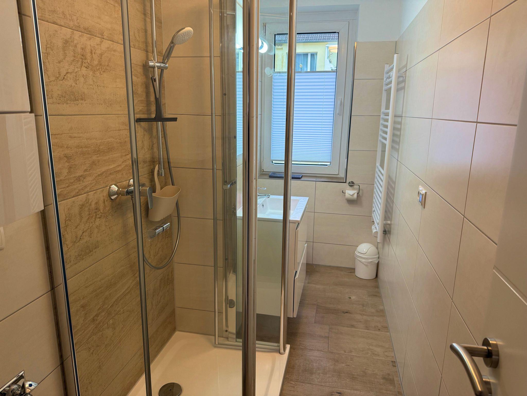 ? schickes Duschbad mit ebenerdigem Einstieg, dazu noch weiteres Berker Radio mit Bluetooth-Funktion, ein Fön ist auch vorhanden