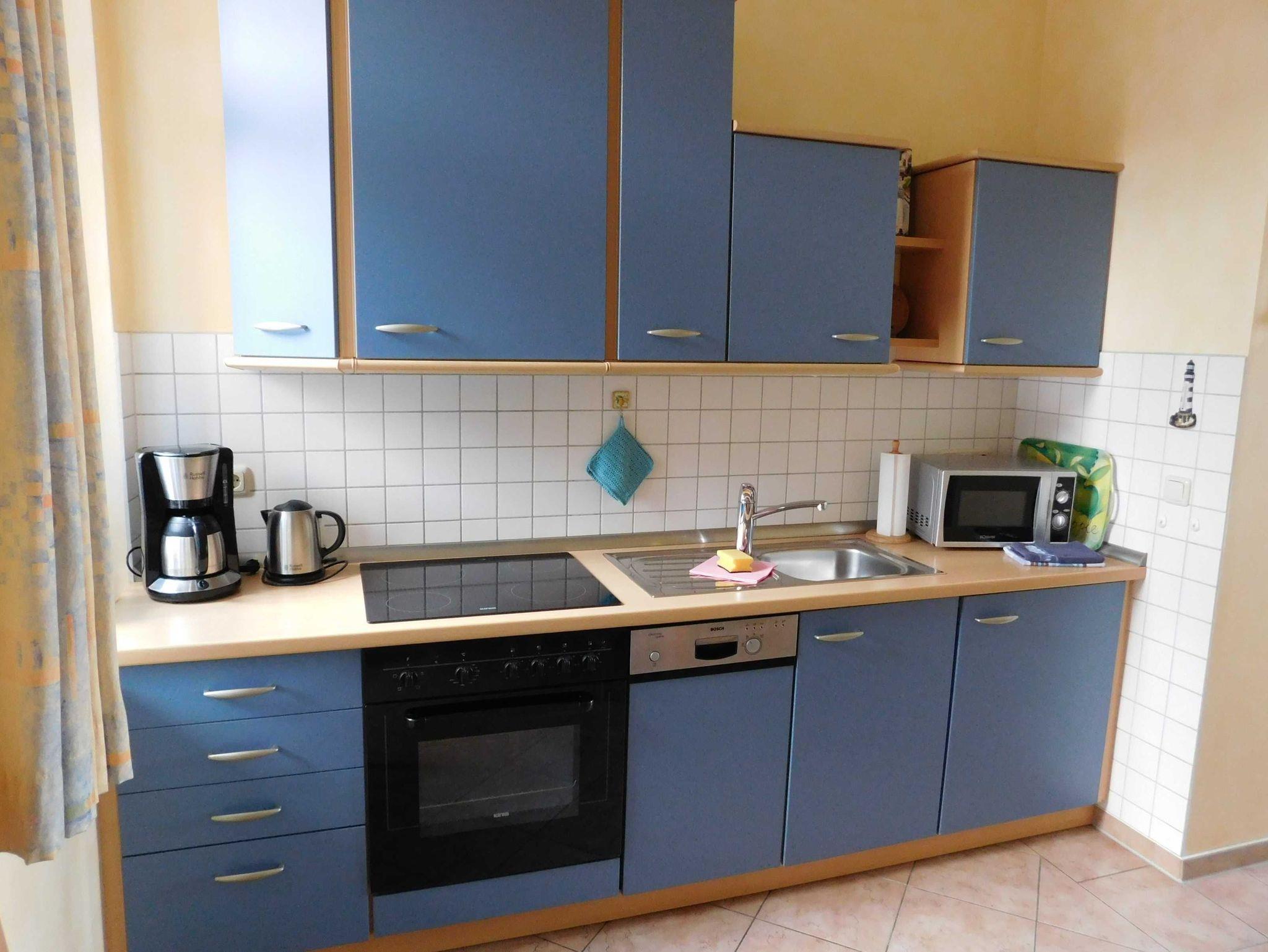 Das Appartement verfügt in oberer Etage über eine komplett ausgestattete Küche mit Ceran-Kochfeld (4 Platten), Backofen, Mikrowelle und Geschirrspüler. Vom seitlichen Küchenfenster aus hat der Gast Blick über seinen kleinen Eingangsbereich auf die gegenüberliegende Hofterrasse, die sehr gerne von den Feriengästen genutzt werden kann. Gartenmöbel stehen zur Verfügung und ein Grill kann auf Anfrage sehr gerne genutzt werden. Weiterhin gibt es einen Essbereich und im hinteren Teil den Wohnbereich mit der breiten Fensterfront und Meerblick. Die Couch kann für eine 3./4. Person als Schlafcouch genutzt werden (Liegefläche 1,40 m x 1,80 m). Kabel-TV, DVD-Player, CD-Player sowie WLAN sind in diesem modernen Appartement selbstverständlich und im Preis inklusive.