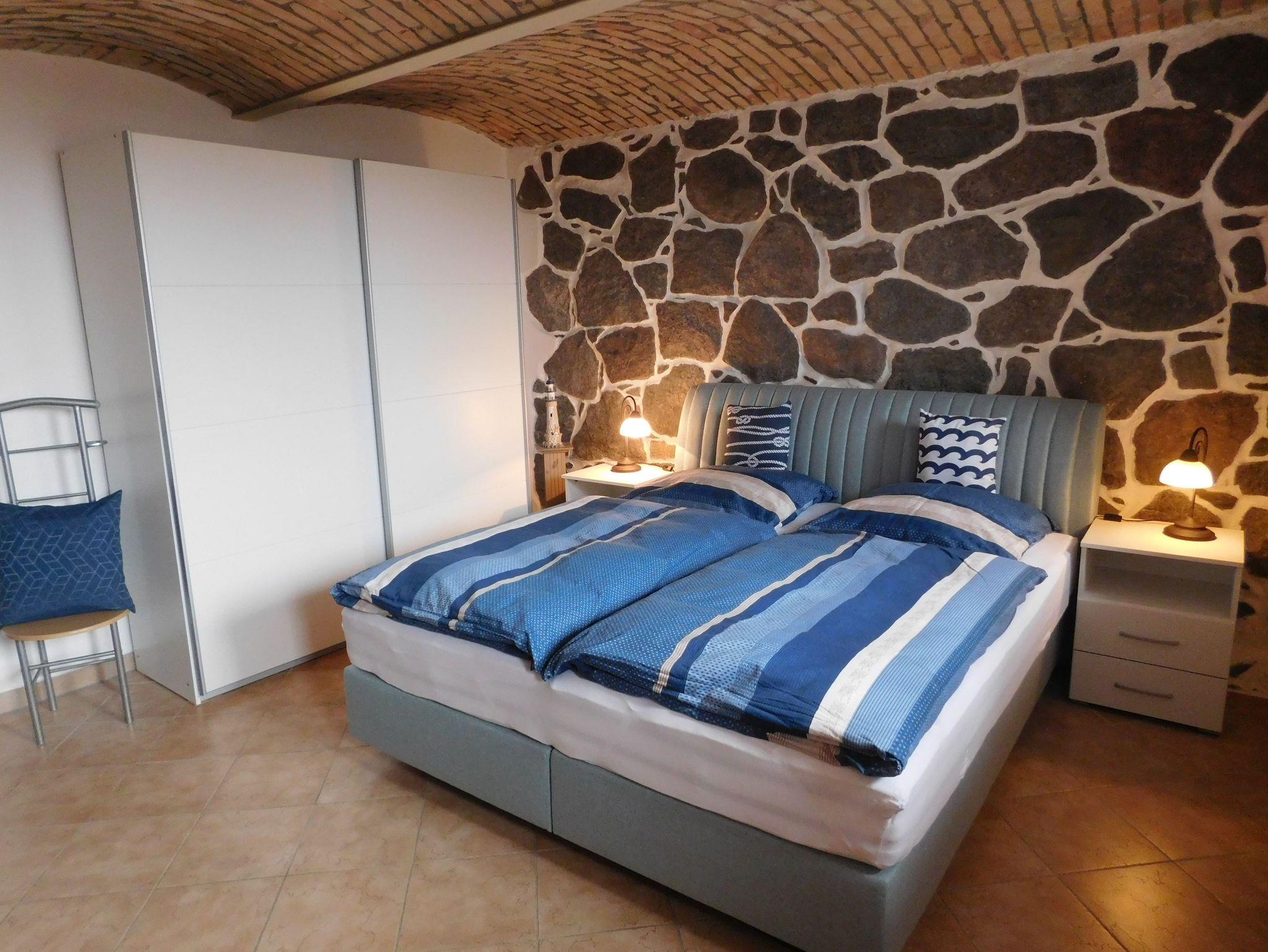 Im unteren Bereich des Maisonette-Appartements befindet sich das großzügige Schlafzimmer, das gerade Ende 2022 renoviert wurde. Das Deckengewölbe und die teilweise original Mauerwand spiegeln absolut den historischen Charme dieses Feriendomiziles wieder.