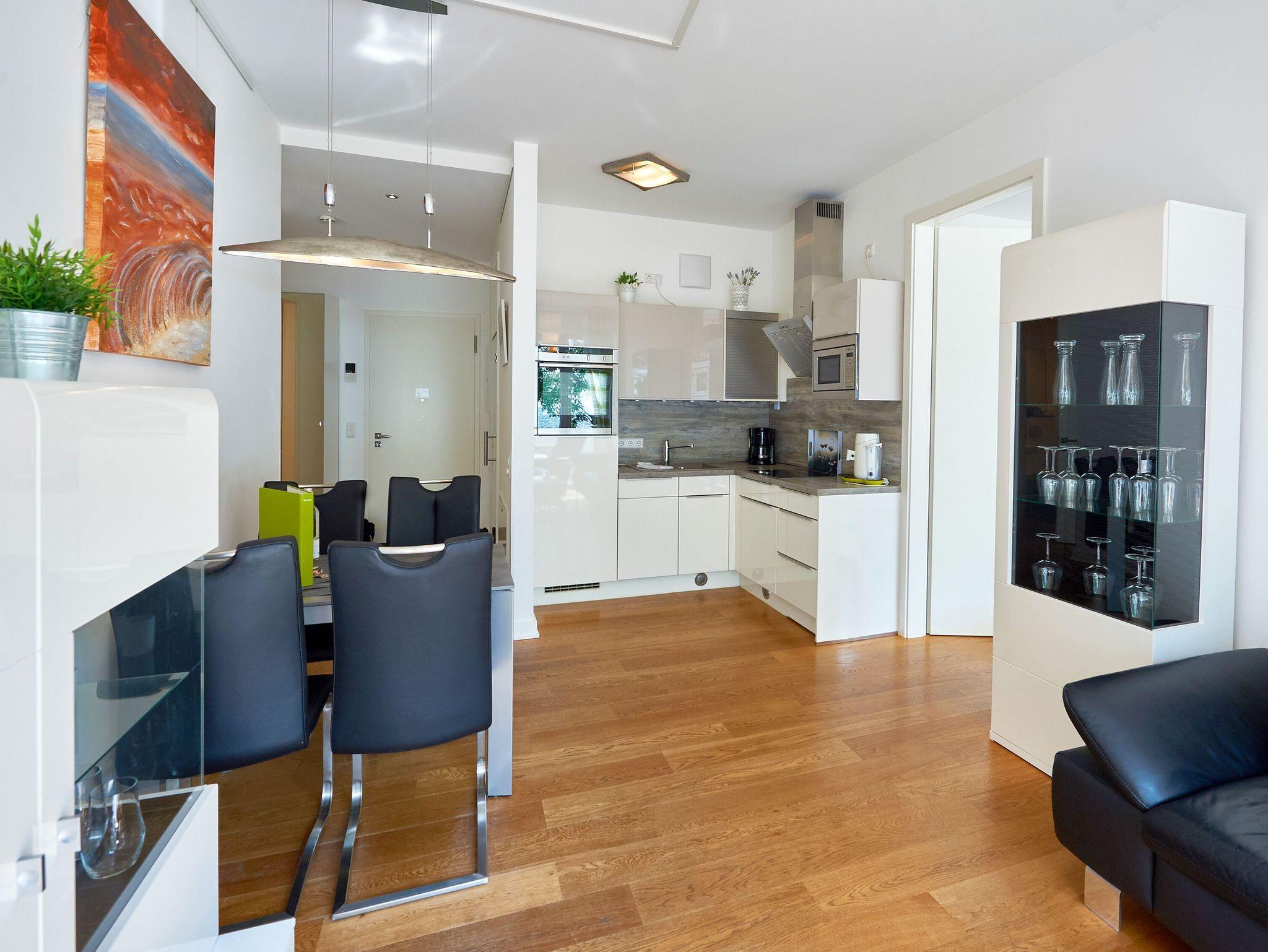 offener, komfortabel ausgestatteter Küchenbereich (Induktionskochfeld, Backofen, Mikrowelle, Geschirrspüler, Senseo Kaffeemaschine)