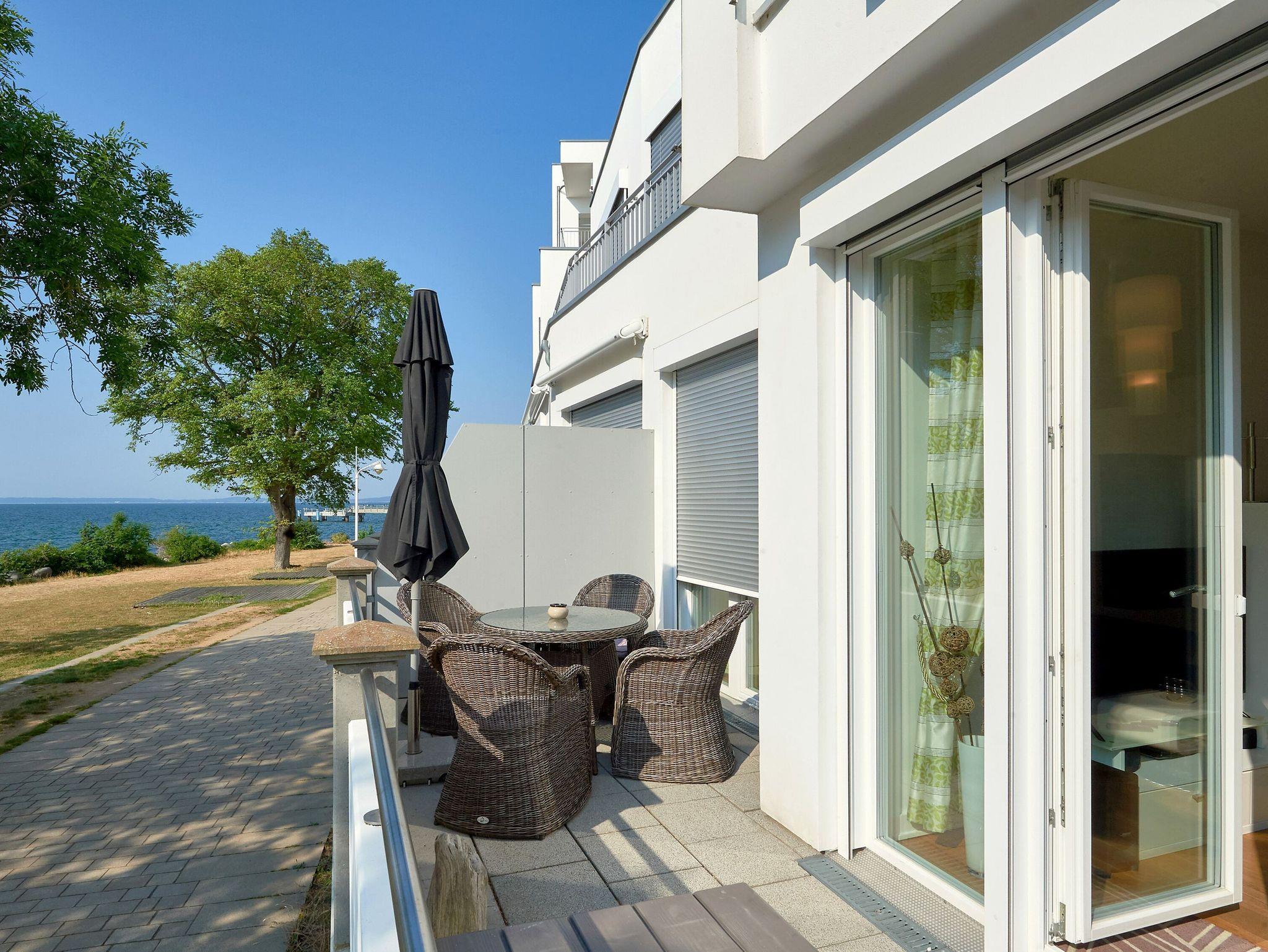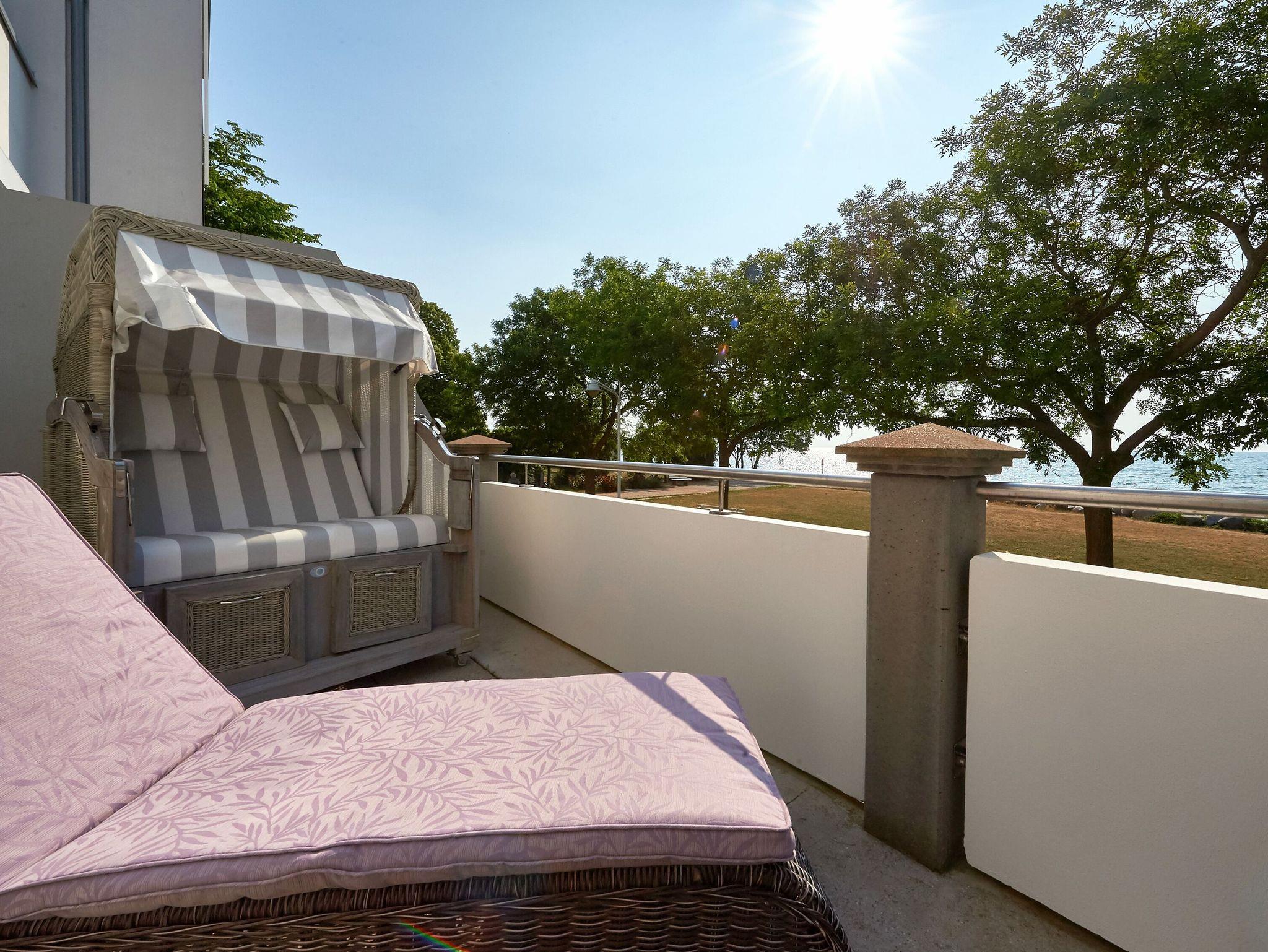 ? Terrasse, nach Süden ausgerichtet mit Strandkorb und grandiosen Sonnenaufgängen, Meerblick und Meeresrauschen Die Balkon- bzw. Terrassenmöbel stehen saisonal - in der Regel von Mai bis Ende September - zur Verfügung.