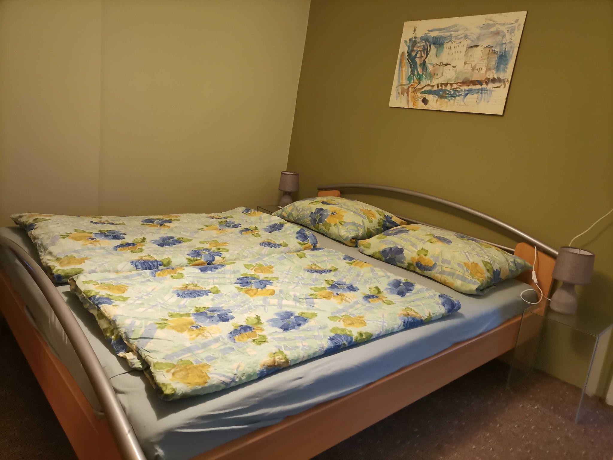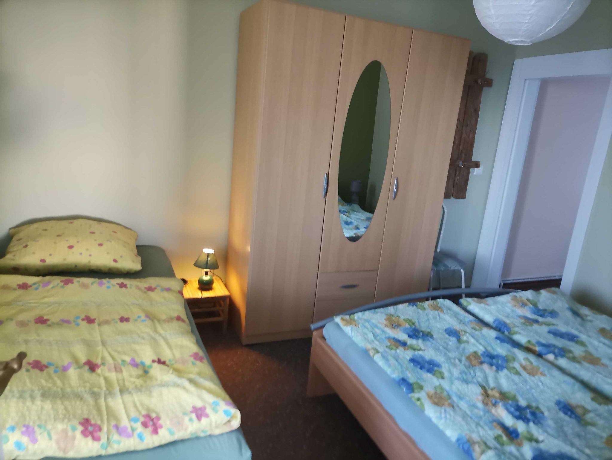 Die Schlafstube bietet ein französisches Bett und eine Einzelliege sowie einen Kleiderschrank.