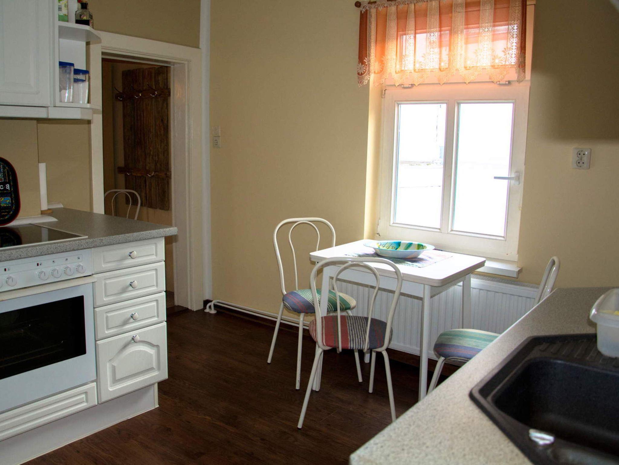 Die Küche ist eine Einbauküche mit Cerankochfeld, Mikrowelle, Kühlschrank und einem ausziehbaren Tisch mit 4 Stühle. Die Küche ist komplett ausgestattet u.a. mit Kaffeemaschine, Toaster und Wasserkocher.