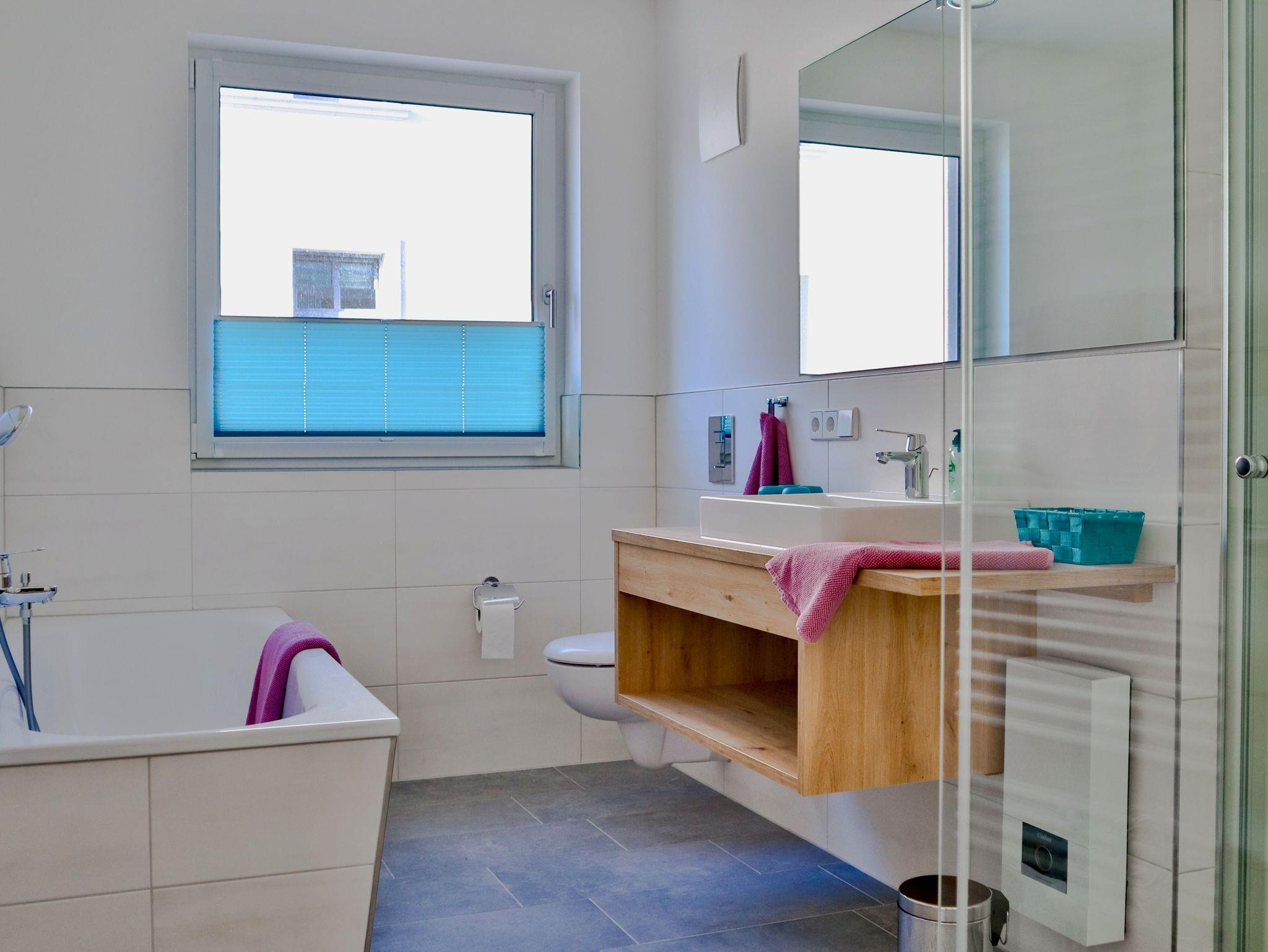 Die neue & hochwertig ausgestattete Ferienwohnung verfügt über zwei Schlafzimmer, jeweils mit Doppelbett (200 × 180) sowie ein Badezimmer mit Dusche, Badewanne & WC sowie Fön.
