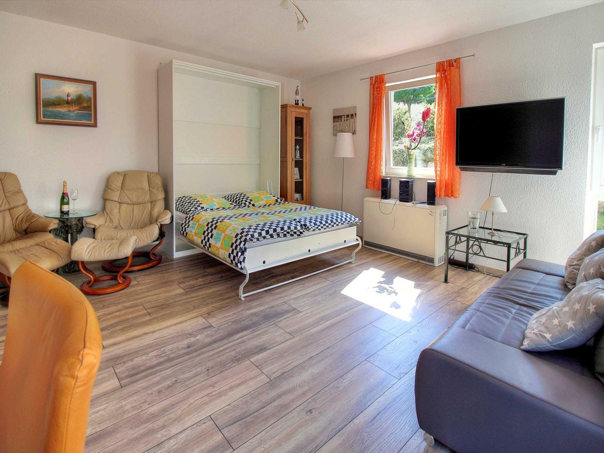 - Kombinierter Wohn-Schlafraum mit Schrankbett (1,60 m x 2,00 m, getrennte Matratzen), Sitzecke mit 2 Relaxsesseln, Couch, Flachbildfernseher, Stereoanlage, DVD-Player, Kleiderschrank