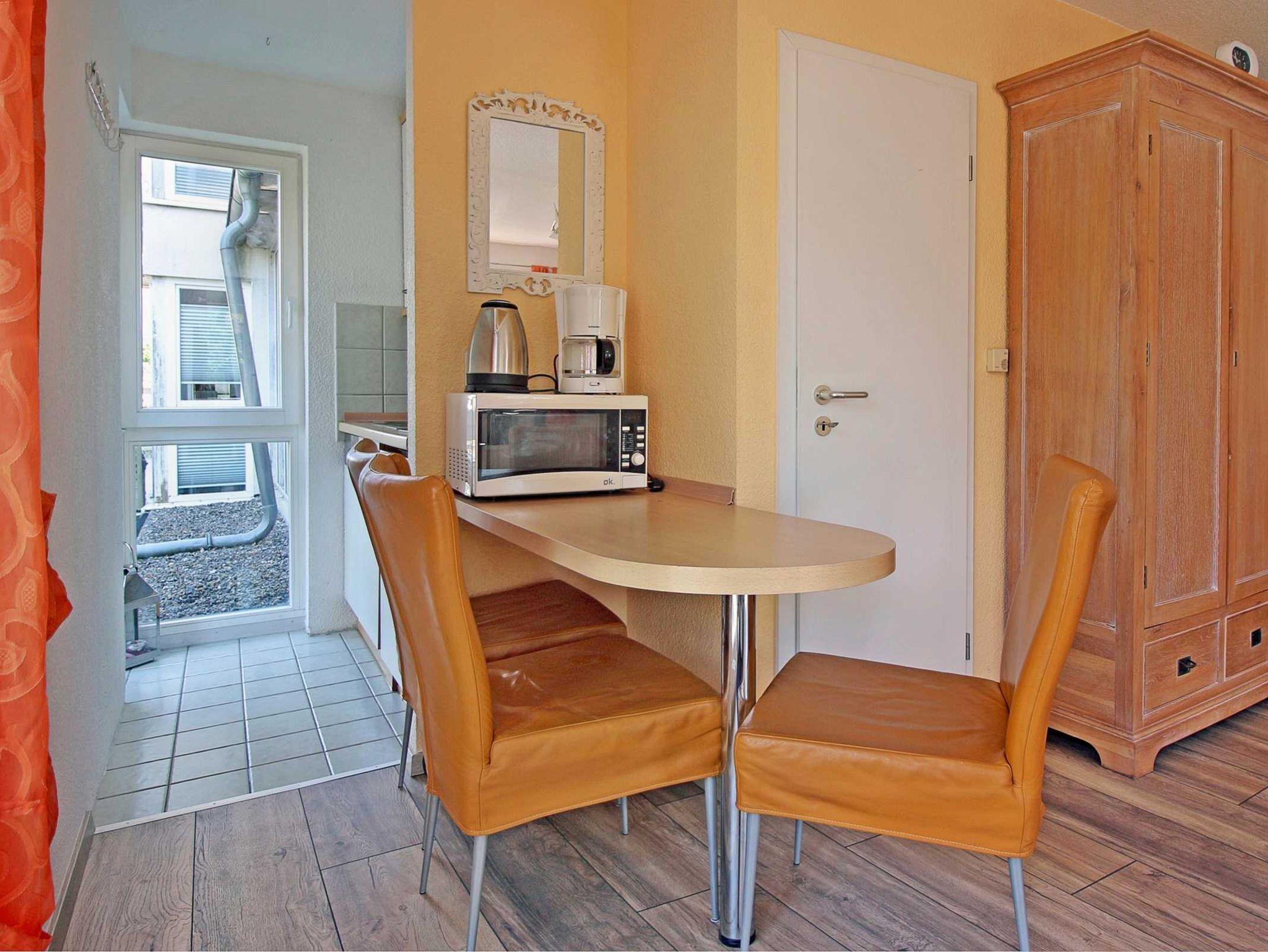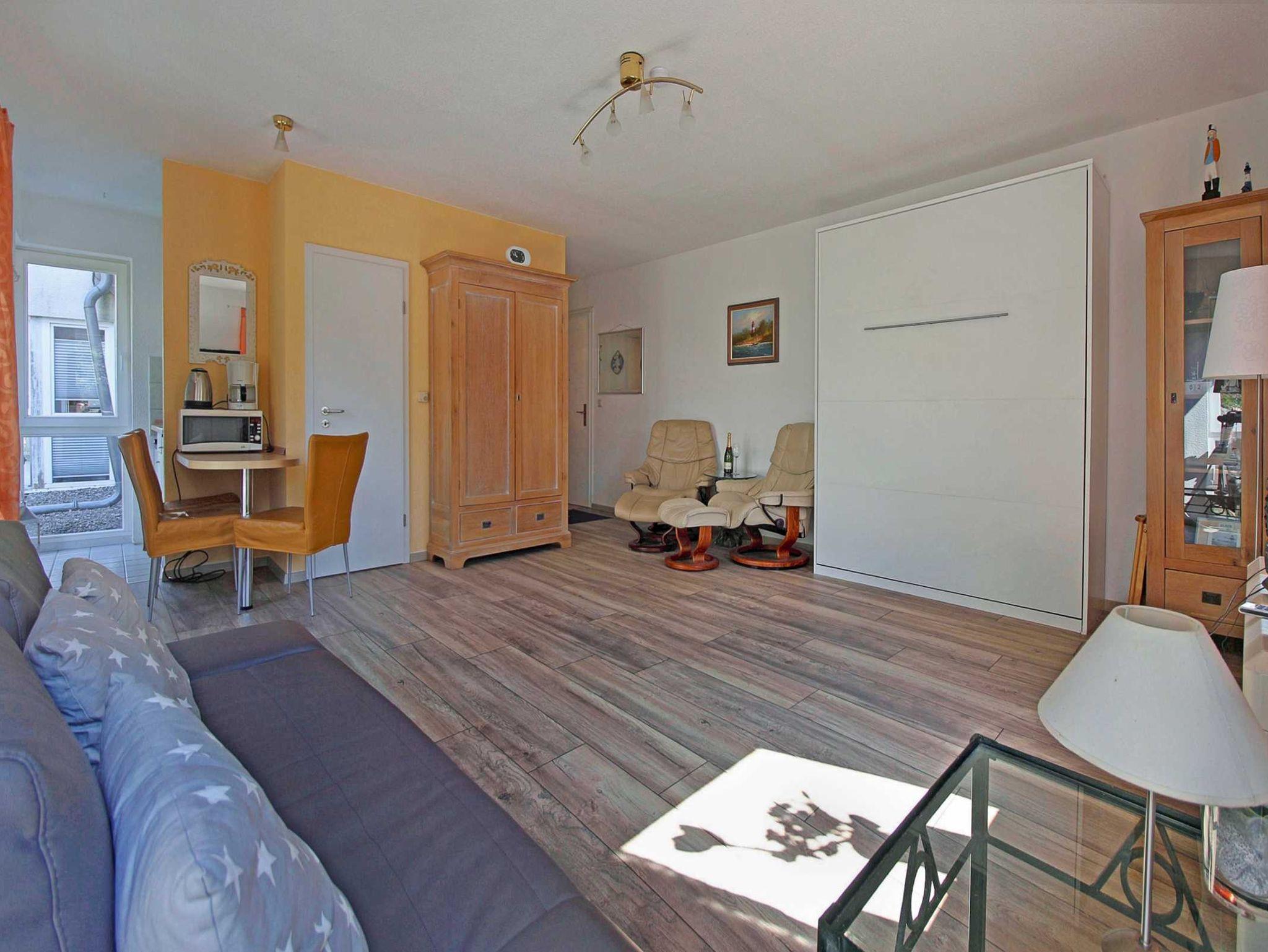 Das gemütliche 1-Raum-Appartement hat eine Größe von ca. 43 qm und befindet sich im Erdgeschoss der Villa Monika, zur straßenabgewandten Seite. Es besteht aus einem kombinierten Wohn-Schlafraum, einer kleinen Küchenzeile (mit Geschirrspüler), einer Essecke und einem Bad mit Dusche/WC. Über den Terrassenausgang gelangen Sie in den eigenen kleinen Garten. Hier befinden sich nochmals ein Tisch mit 2 Stühlen, 2 Sonnenliegen und ein Strandkorb zum Relaxen.