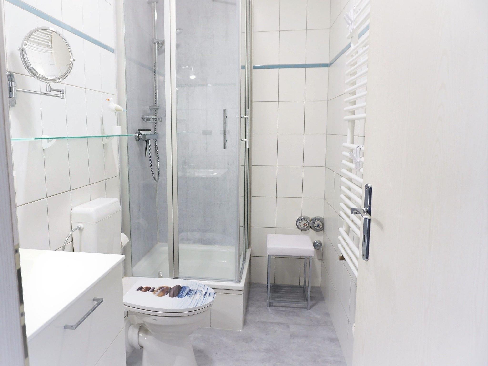 Das ebenfalls im maritimen blau-weiß gehaltene Badezimmer verfügt über Dusche, Waschbecken und WC.
