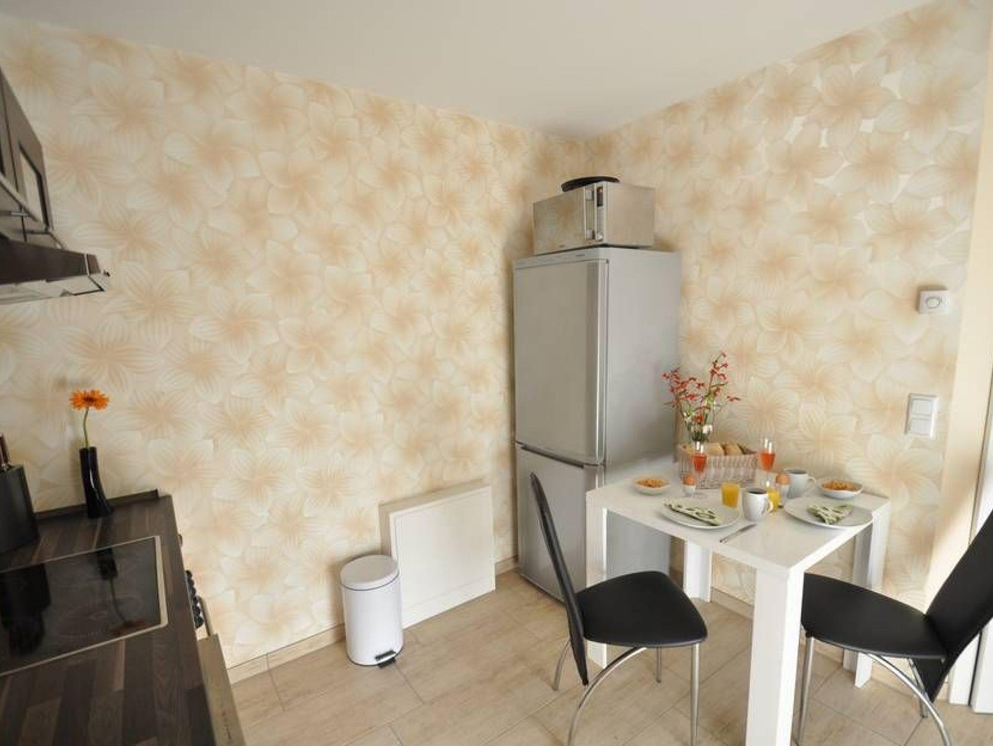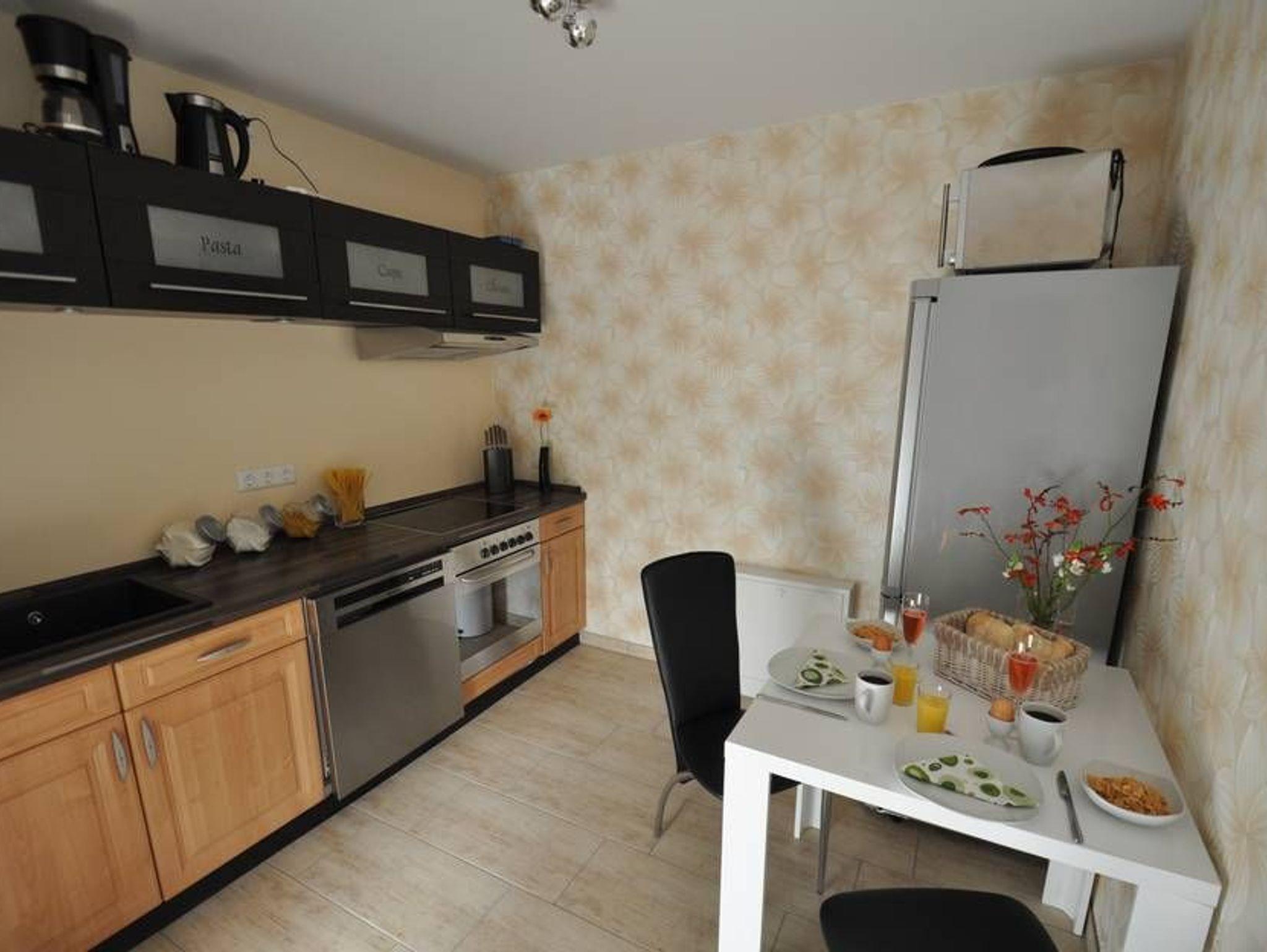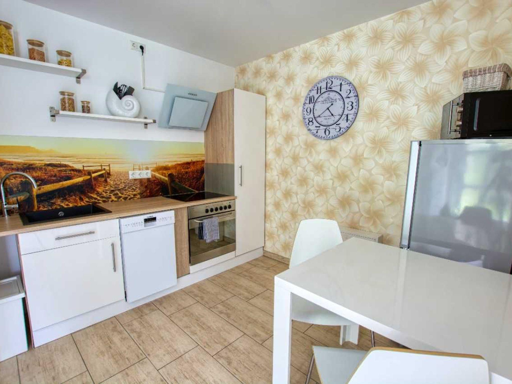 Die modern und offene Küche ist mit einem Herd, Abzugshaube, Backofen, Geschirrspüler, Wasserkocher, Kaffeemaschine, Toaster, Mikrowelle, Kühlschrank mit Frosteinheit und Esstisch mit Stühlen komplett ausgestattet. Im Schlafzimmer wartet auf Sie ein bequemes Doppelbett (140cm breit) sowie ein geräumiger Kleiderschrank.