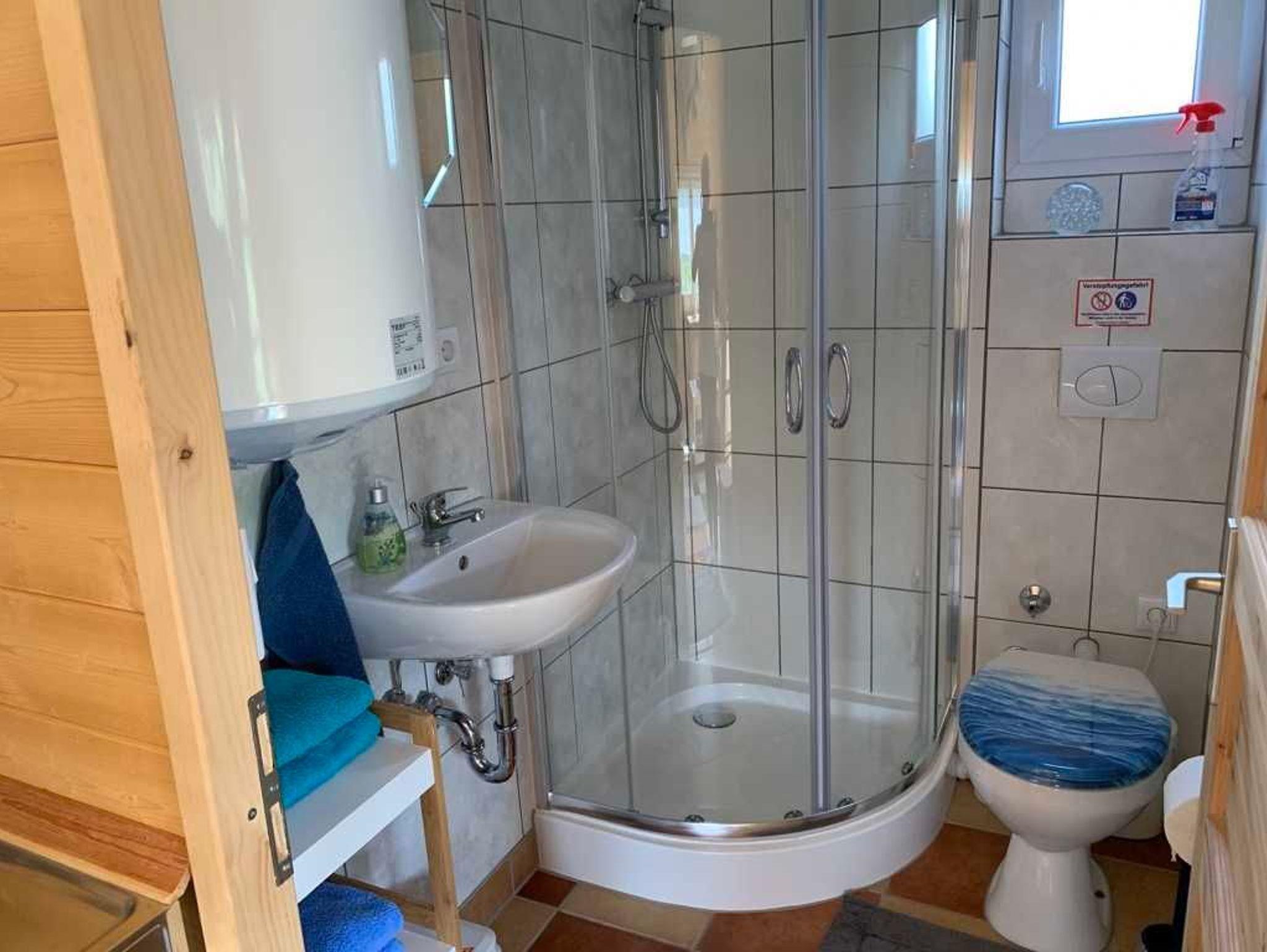 ? Das Bad ist mit Dusche, WC und Fön ausgestattet.