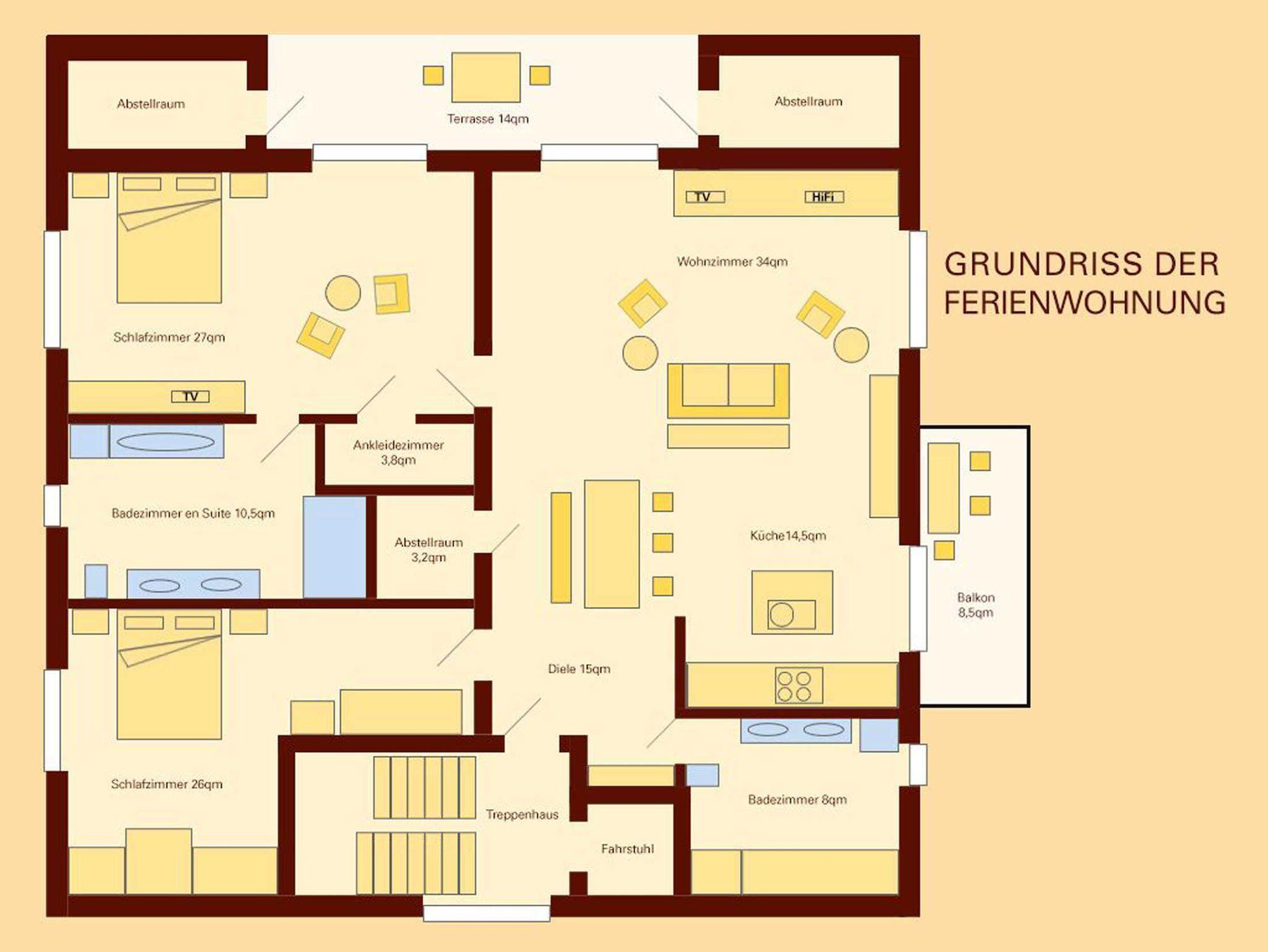 ? Großzügiger Wohn- Essbereich mit hochwertige Ausstattung. Ein Flachbildfernseher (50 Zoll mit Sat-Empfang) und Blu-ray-Player im Wohnzimmer sowie ein 40-Zoll-Flachbildschirm in beiden Schlafzimmern runden das TV / HiFi-Programm ab. Eine Bose-Soundanlage verwöhnt Sie mit tollem Klang in jedem Raum der Ferienwohnung (separat schaltbar). Weiterhin bietet die Wohnung kostenfreies W-LAN.