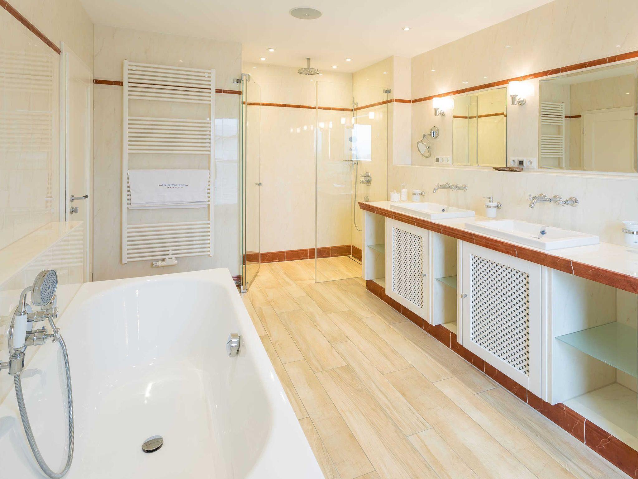 ? Moderne Bäder mit Badewanne und Wellnessdusche. Auch eine Waschmaschine steht bereit.