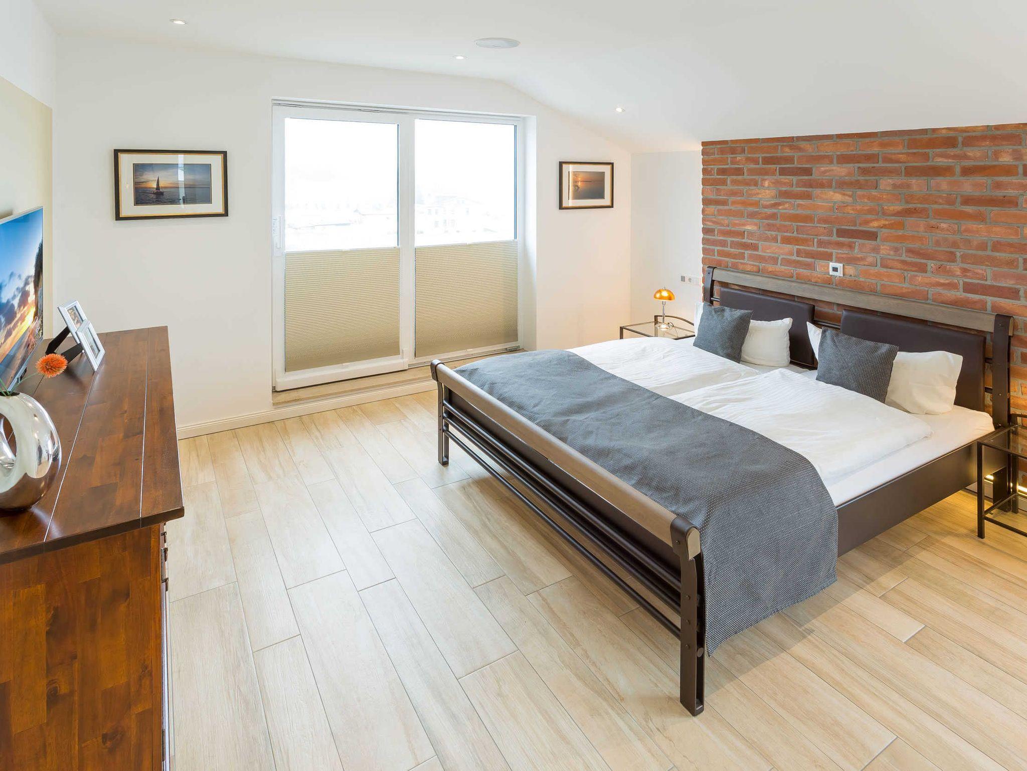 ? Ein Schlafzimmer mit großem Doppelbett, begehbaren Kleiderschrank, Tunnelkamin und zusätzlichem Relaxsessel.