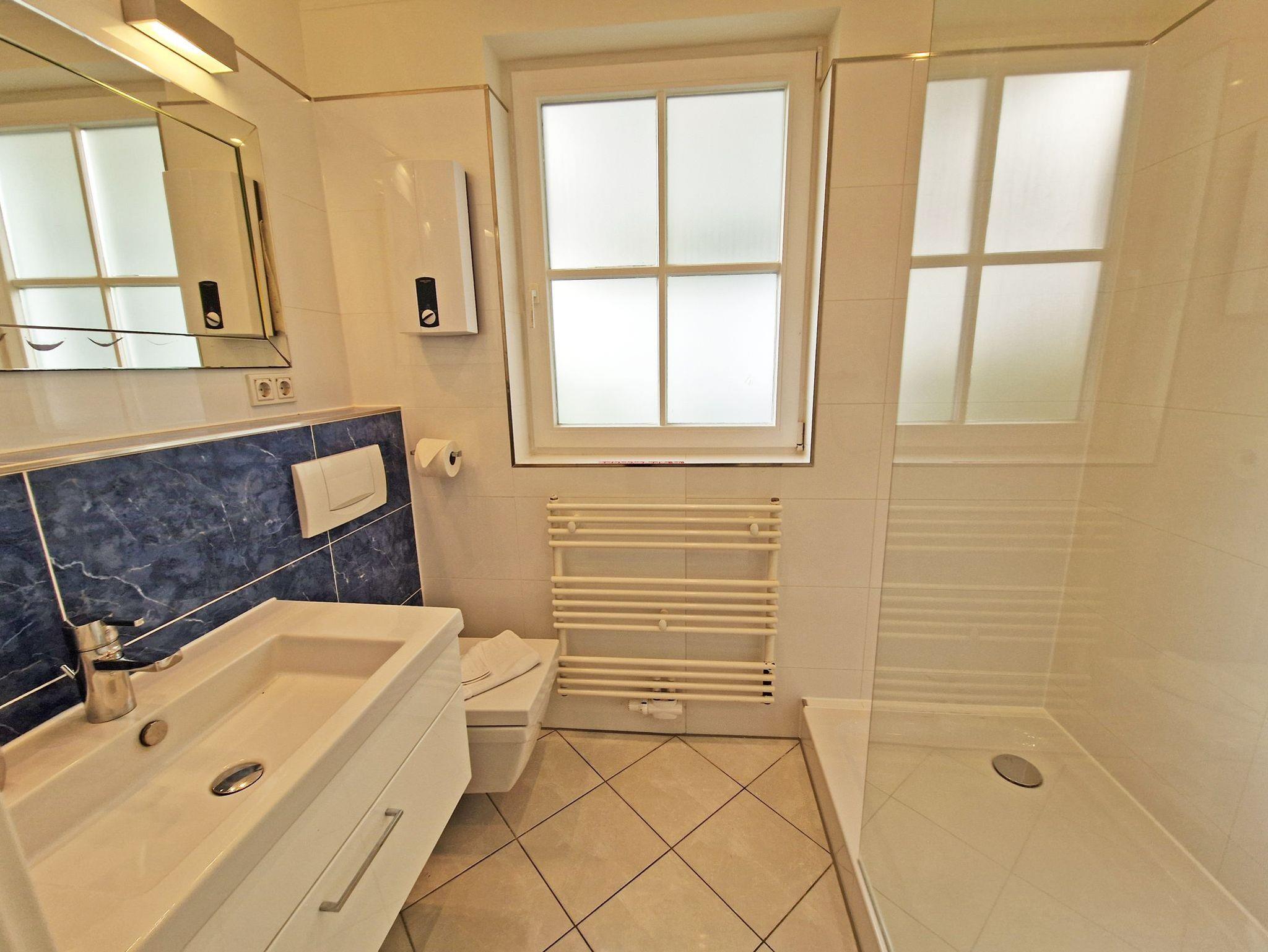 ? Das Badezimmer ist mit einer großräumigen Dusche, Waschtisch und WC eingerichtet.